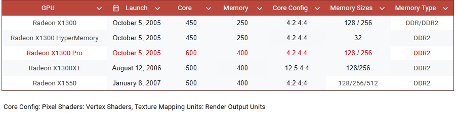 The ATI Radeon X1300 series, launched on October 5, 2005, was the budget end of ATI’s Radeon X1000 series of graphics cards.