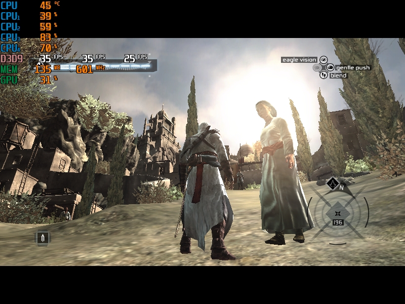 Dropping below the minimum specs again, the game is actually playable on the 7300GT, for the first time it felt actually smooth to run around in with a budget card – albeit at 800×600 low.