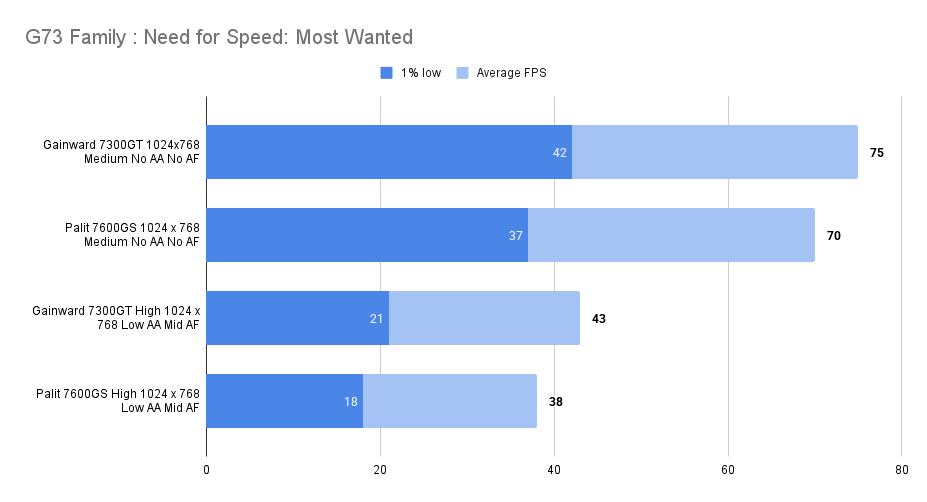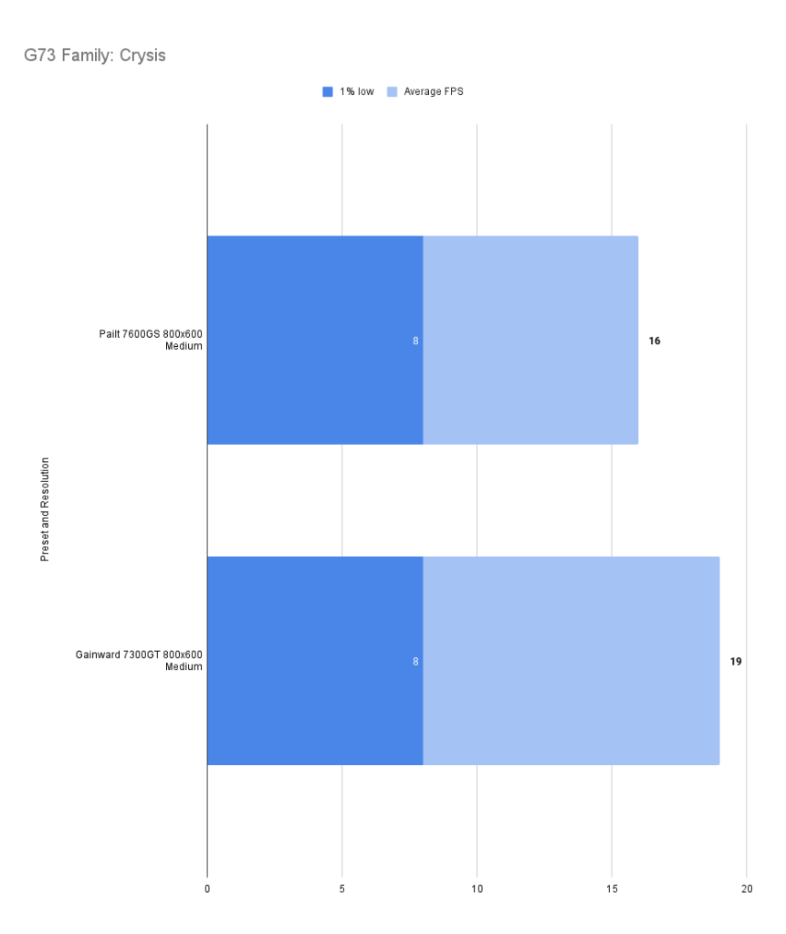It’s easy to get carried away though, G73 GPU’s are far from strong enough for the medium preset in this game. the 7300GT wins out over the 7600GS yet again, but we’re used to that now.