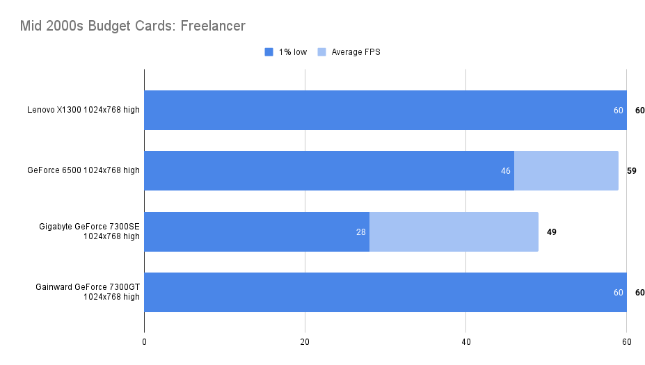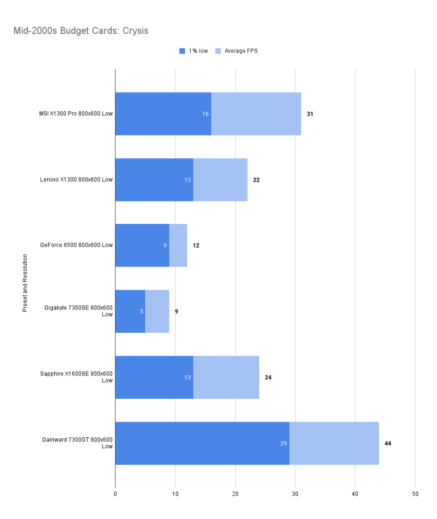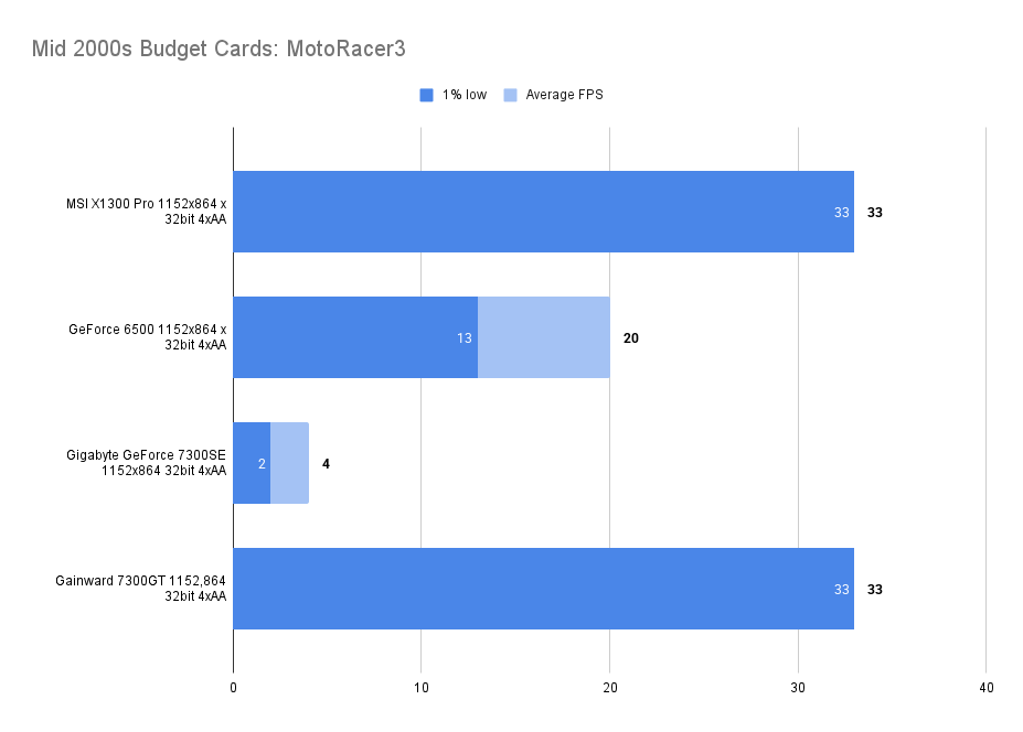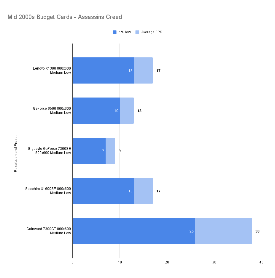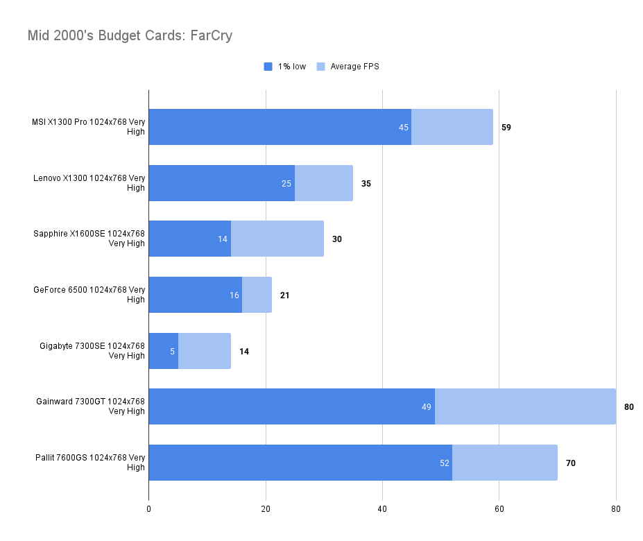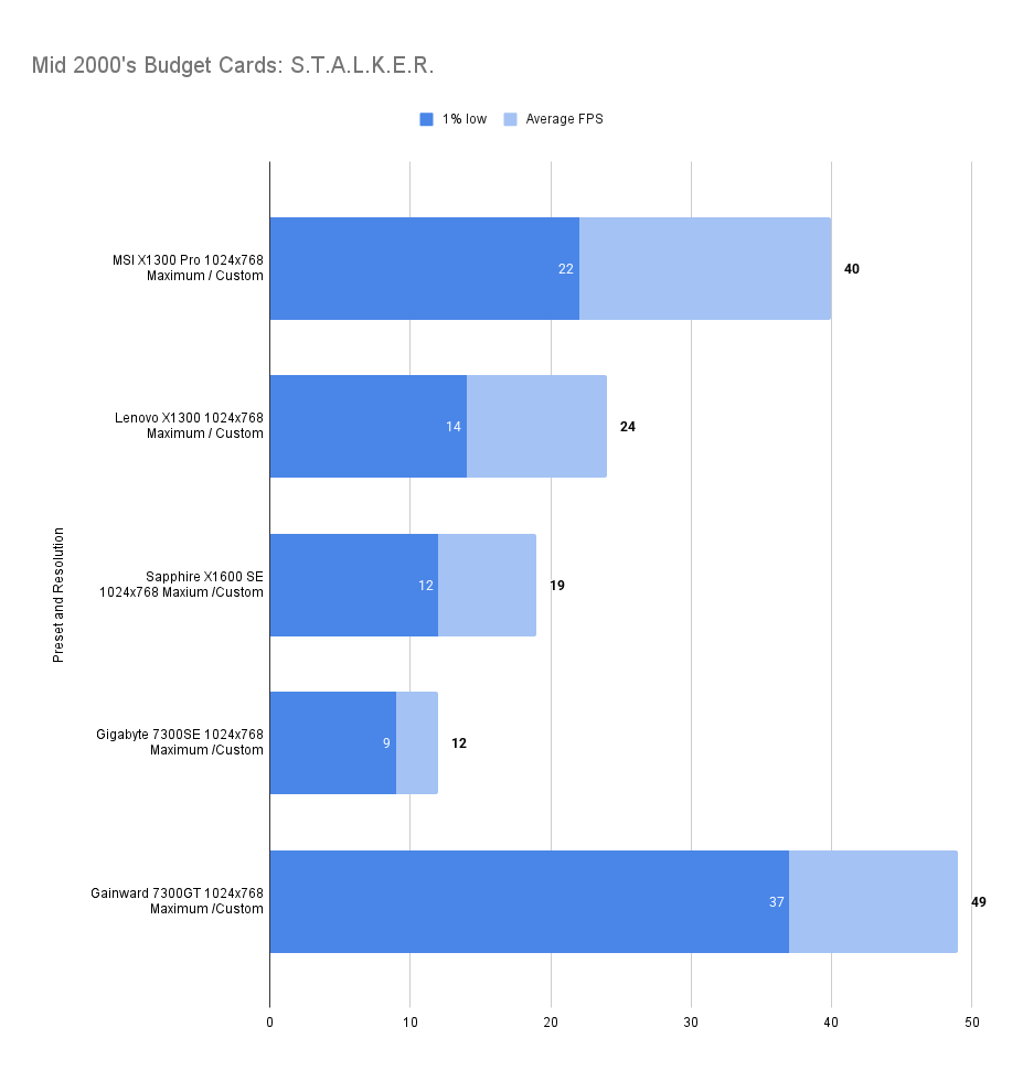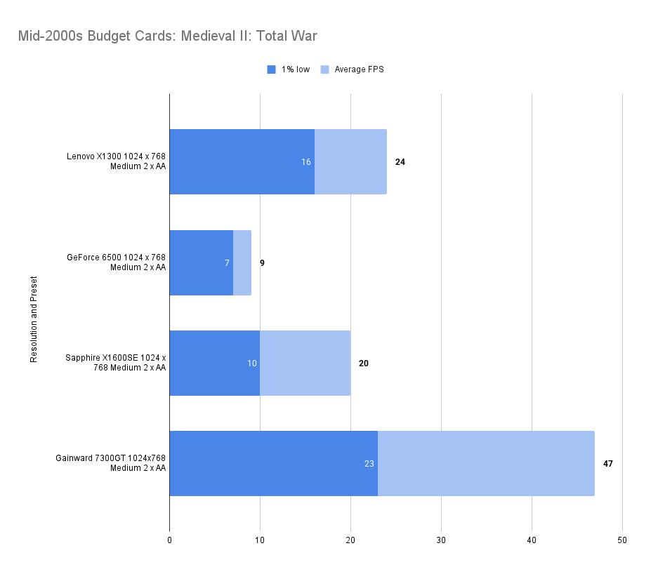 It’s a useful improvement over the X1300Pro whilst matching the 1% low at 1024 x 768 medium.