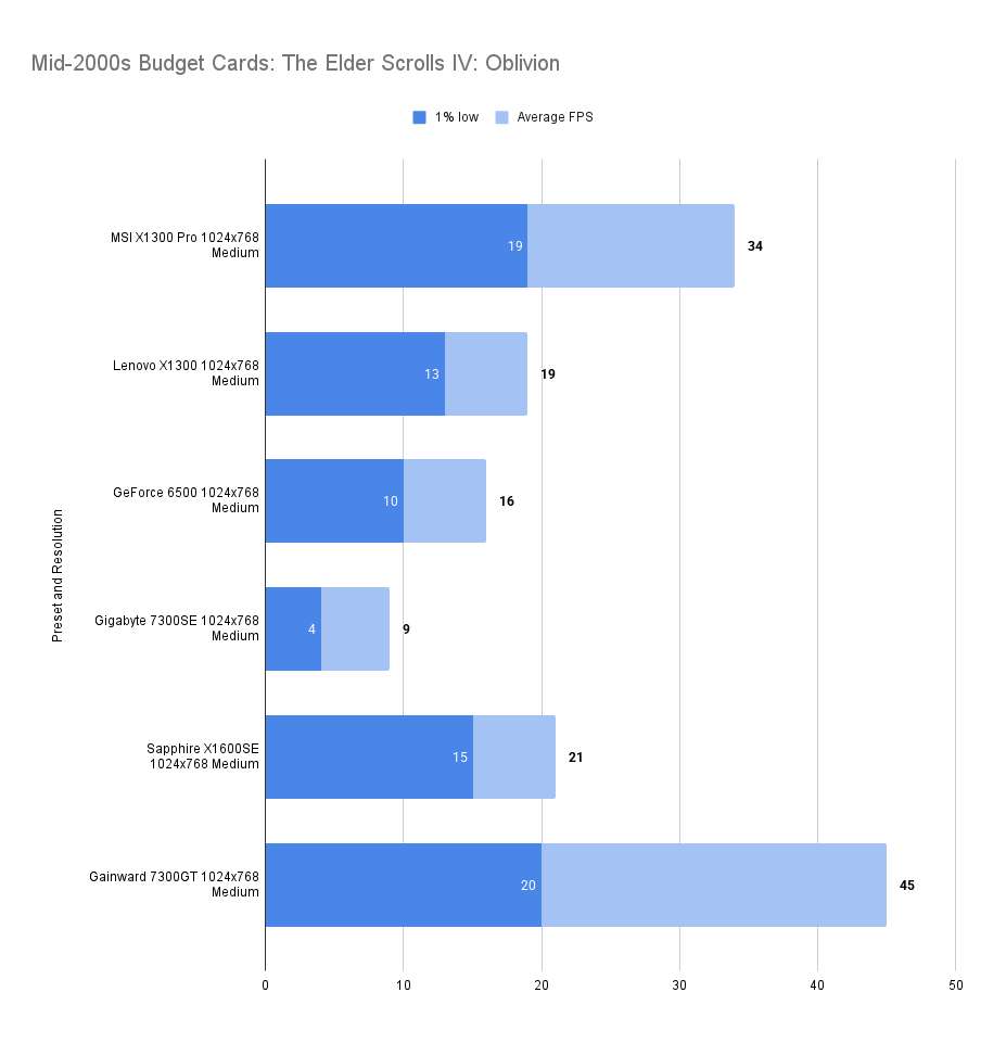 In Oblivion we see the familiar strong performance in comparison to the other budget cards of the Mid-2000’s but not winning by quite the normal margin.
