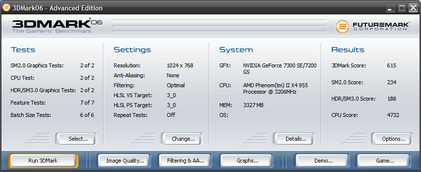 Heh, I think when GeForce7300 made it into the recommended specs, they weren’t thinking of a 7300SE with 64Mb of VRAM and a 32bit memory bus.