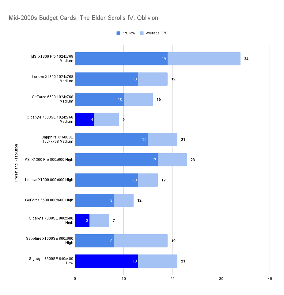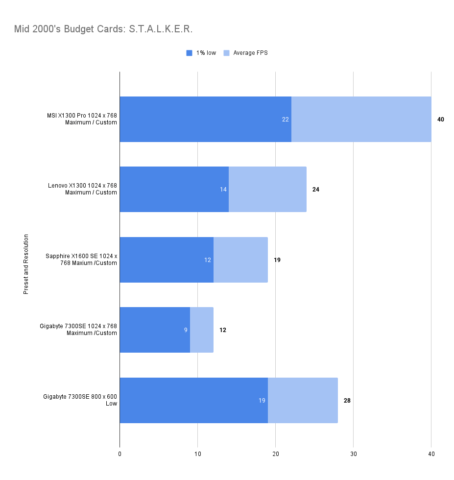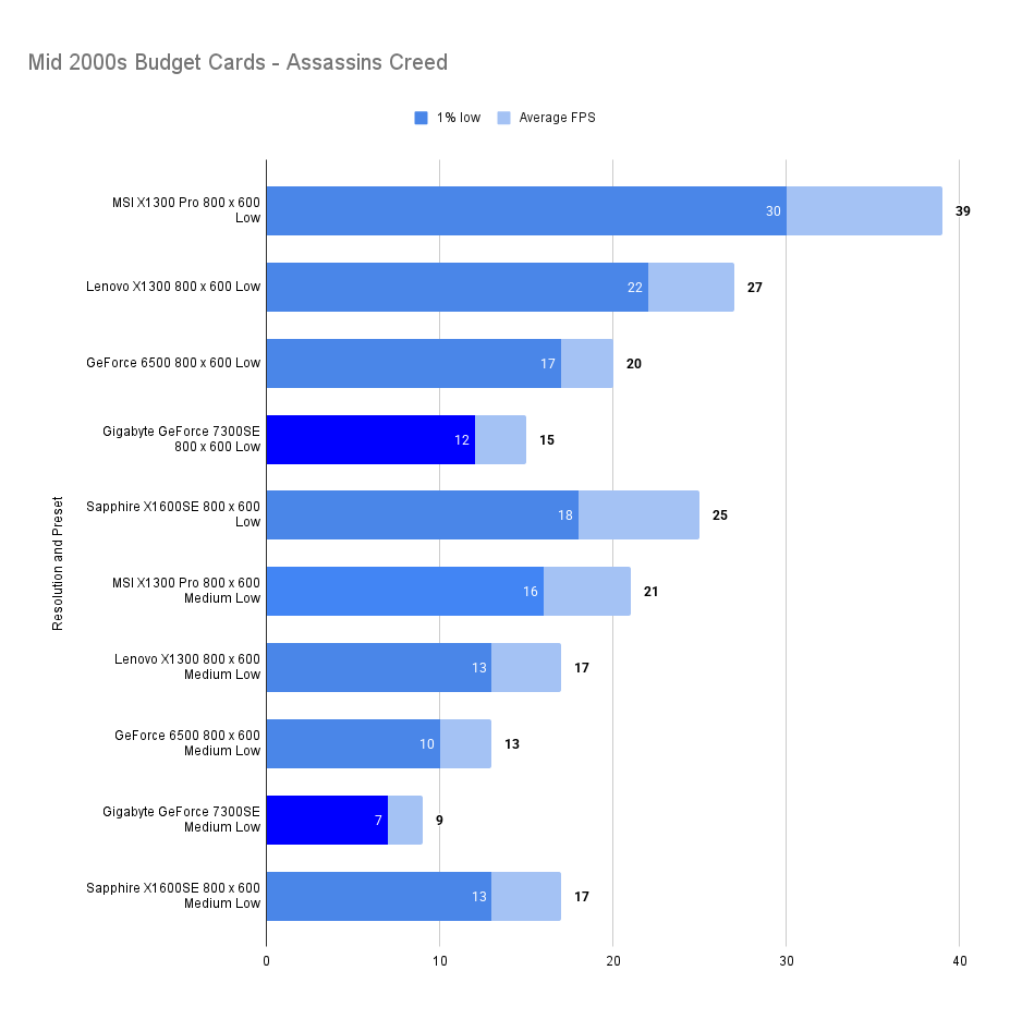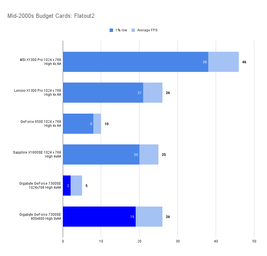 At the same resolution and settings used for the X1300 series of cards, this 7300SE pushed out an awful 1.5fps 1% low and 3.5% average framerates, so rounding up actually gives them a bit advantage.