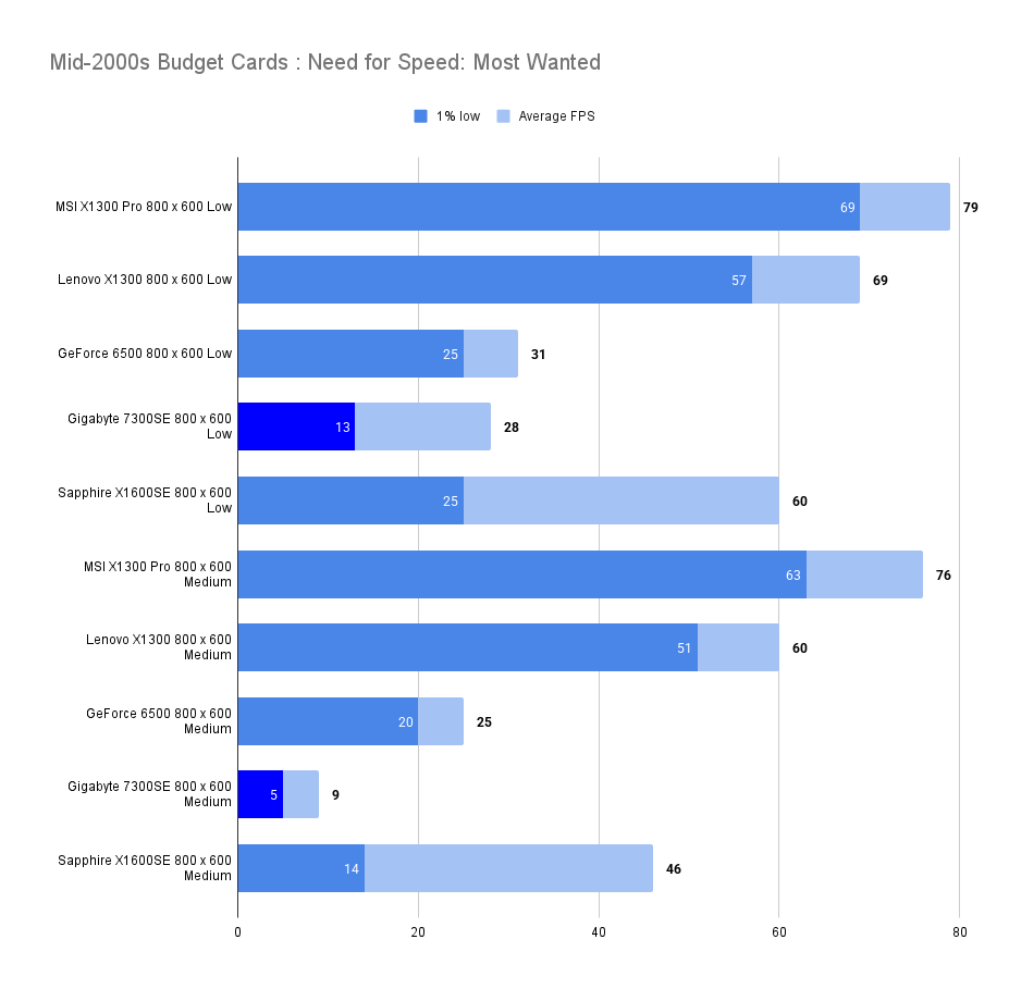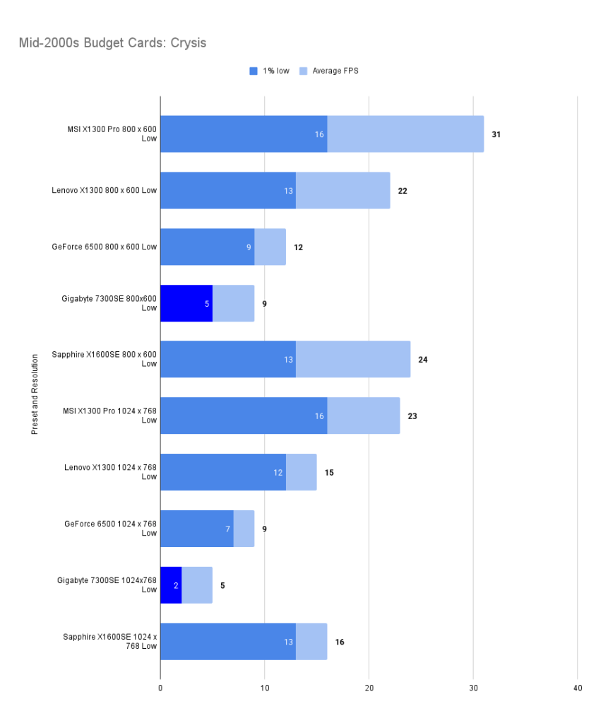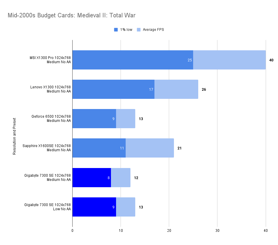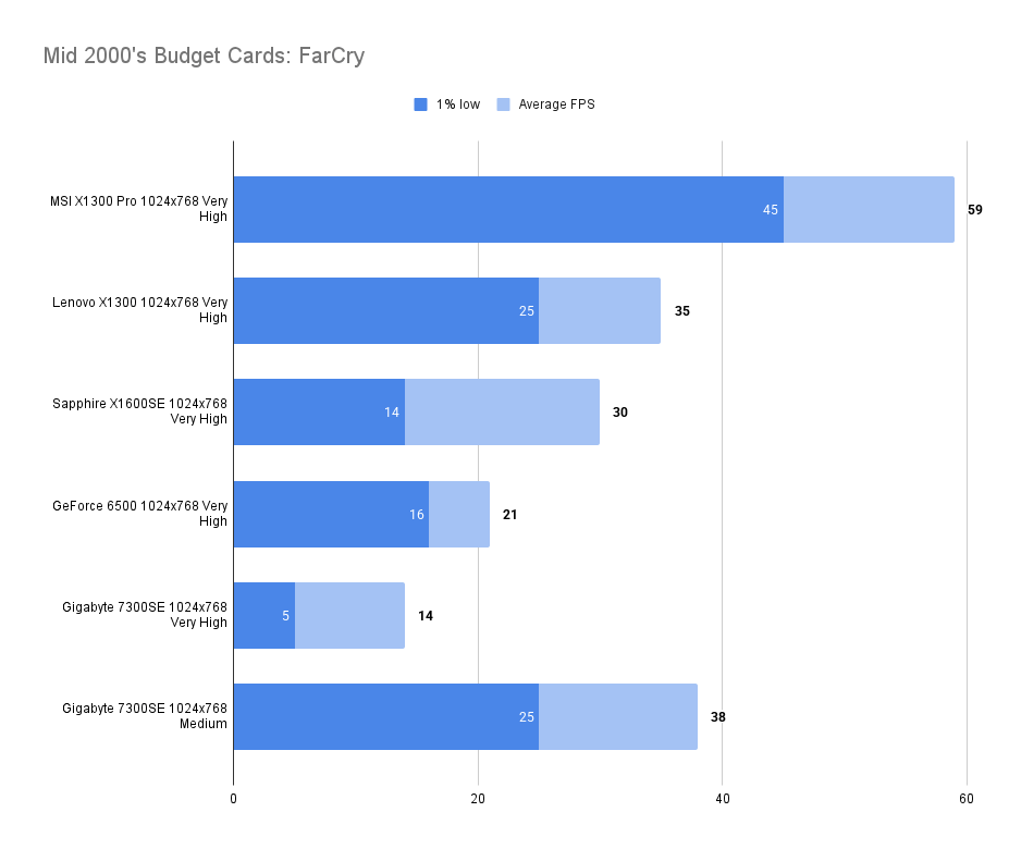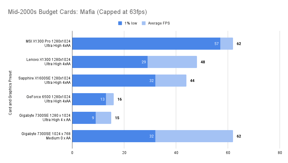 At the same resolution and settings used for the X1300 series of cards, this 7300SE pushed out an awful 1.5fps 1% low and 3.5% average framerates, so rounding up actually gives them a bit advantage.