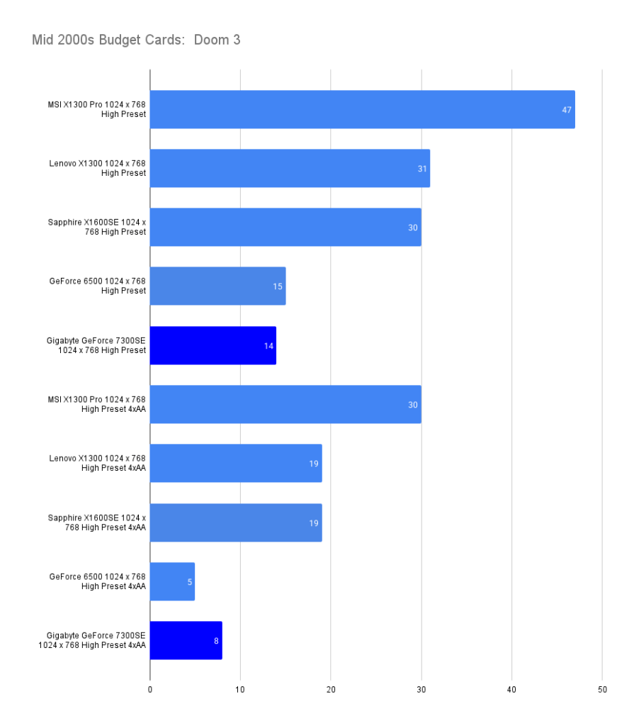 In comparison with the other budget cards from the era, the 7300SE performs poorly, being beaten by the 6500 again without AA but then eeking out a win with it enabled.