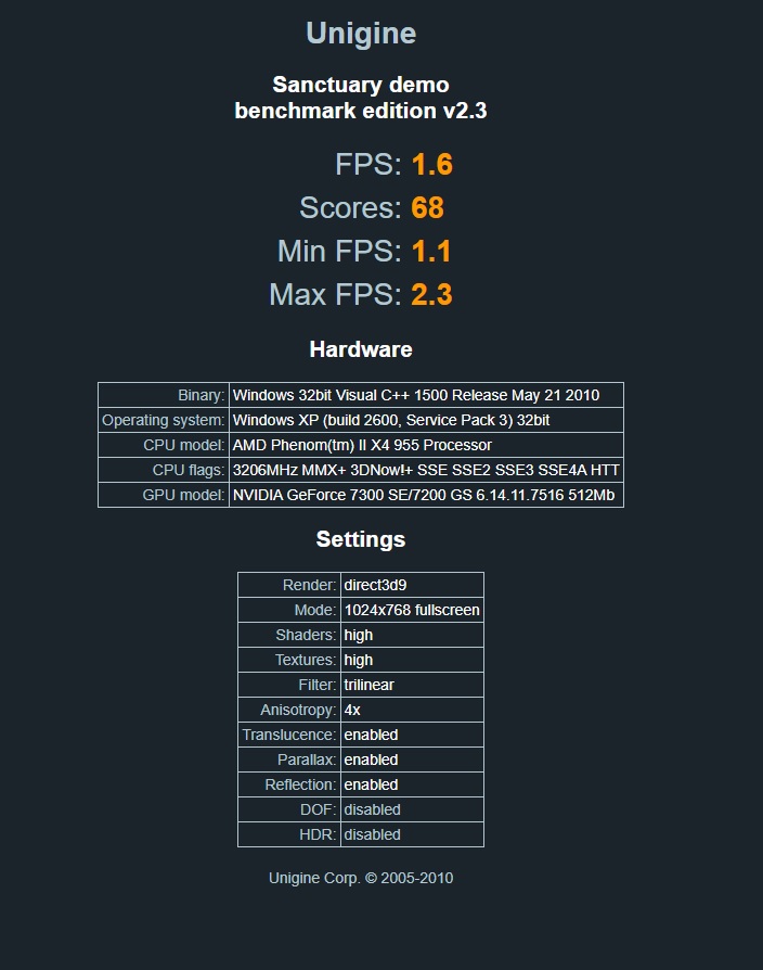 The GeForce 7300 SE is technically capable of launching Sanctuary, but performance is heavily constrained. Its 32-bit memory bus and limited 64Mb of VRAM leads to frequent texture swapping and shader stalls. While it supports the required DirectX 9 features, the card’s low fill rate and lack of driver-level tuning for Unigine workloads result in extremely low frame rates and poor scene fluidity