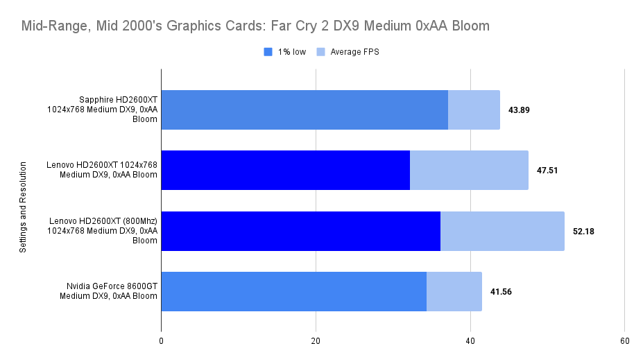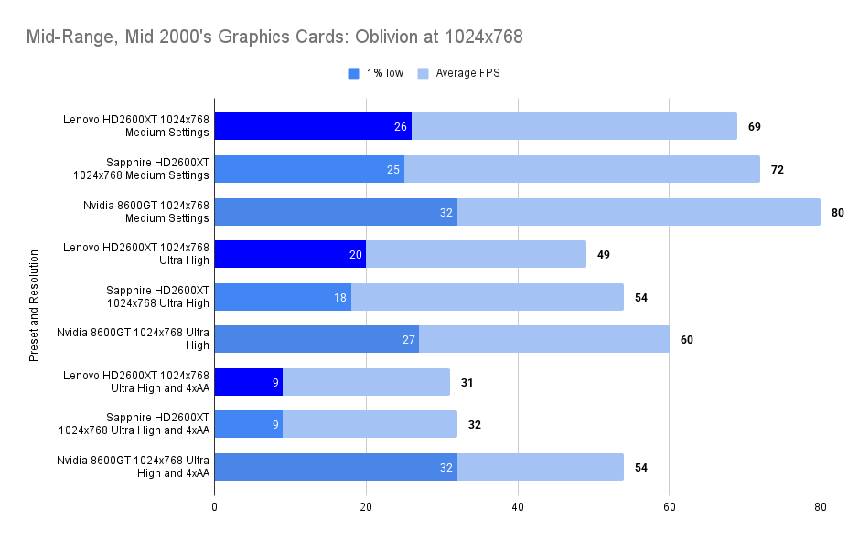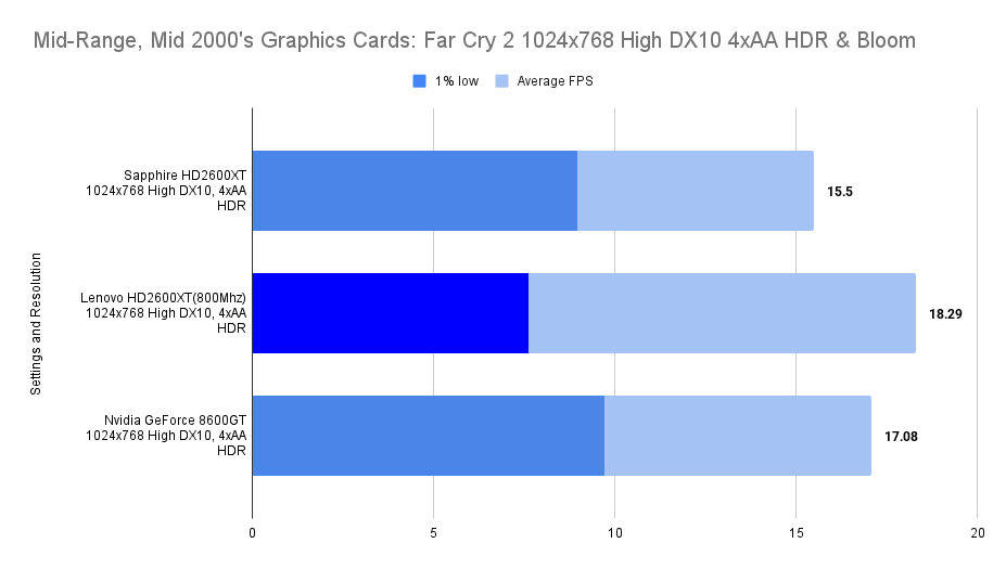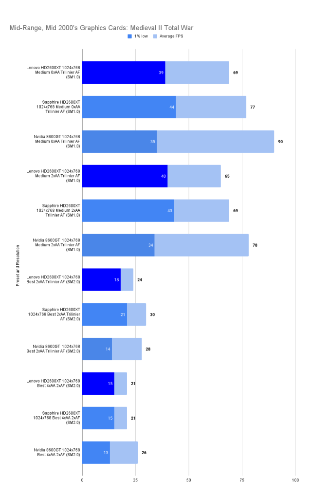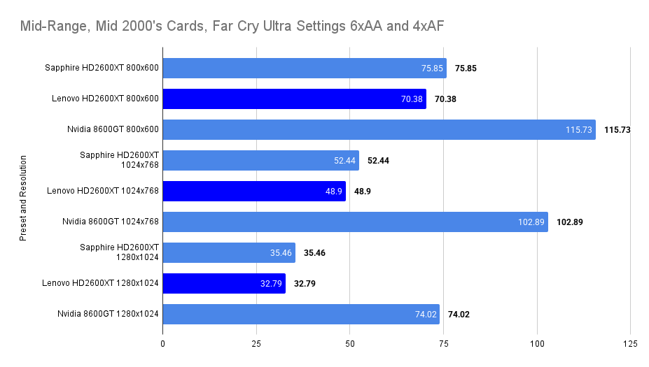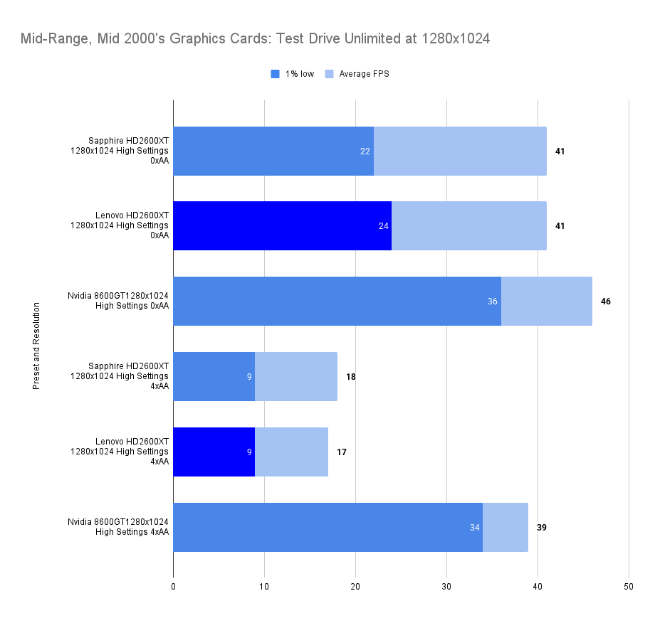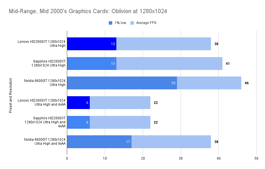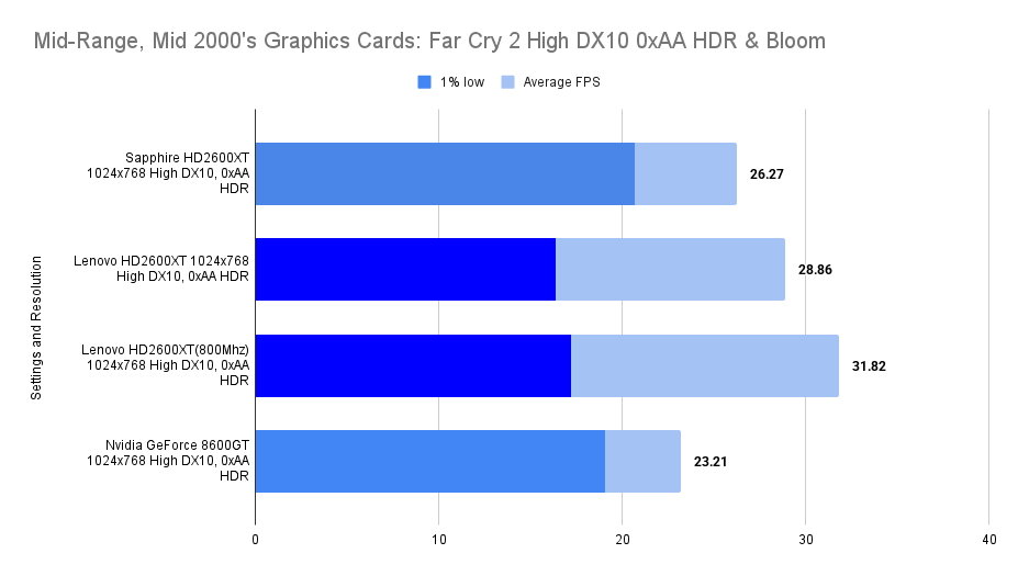 The Lenovo HD2600XT holds its own against the faster-clocked Sapphire variant, matching its 1% lows and trailing only slightly in average FPS. Despite the clock disadvantage, the 512MB VRAM ensures smoother asset handling, especially with high texture detail enabled. Compared to the 8600GT, the Lenovo card delivers a far more stable experience, with double the 1% lows and a 26% higher average. This resolution showcases the Lenovo’s balance: not the fastest, but consistently fluid in this game.