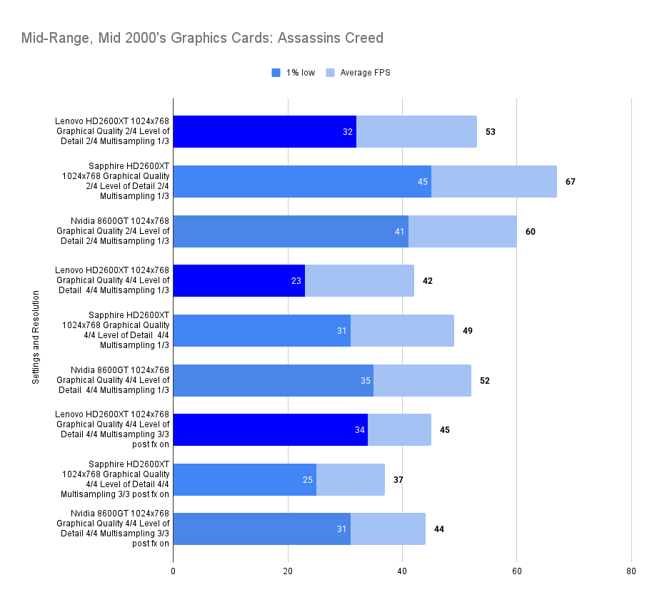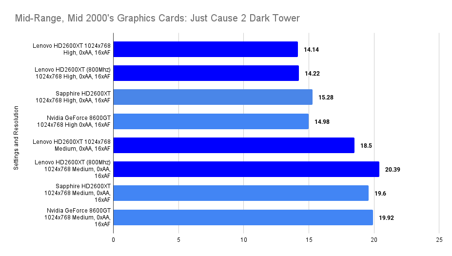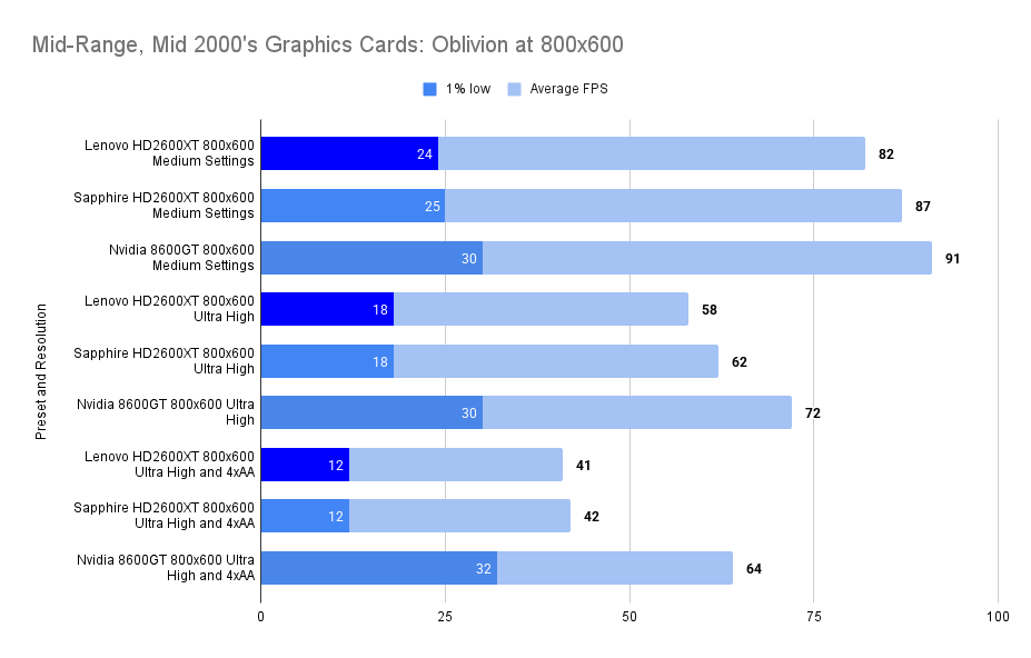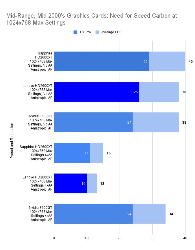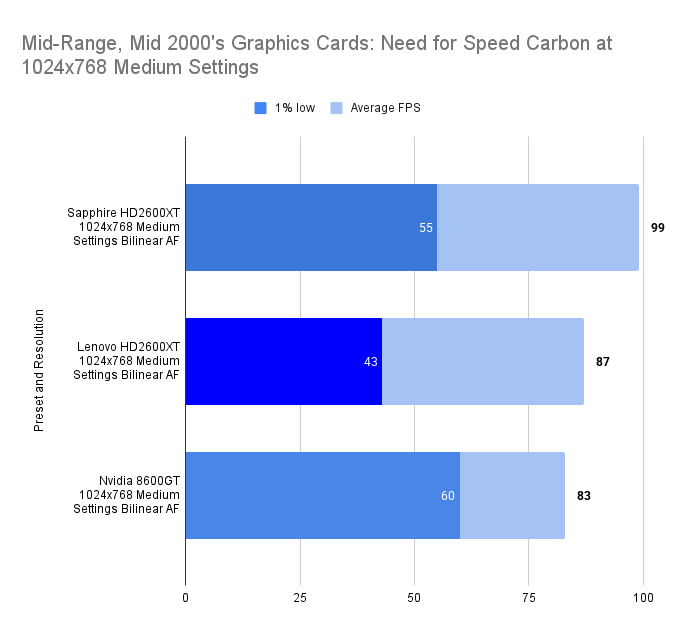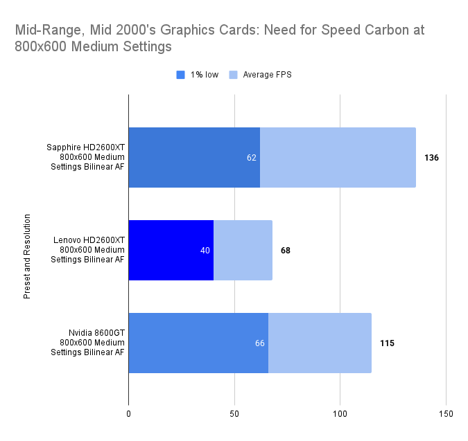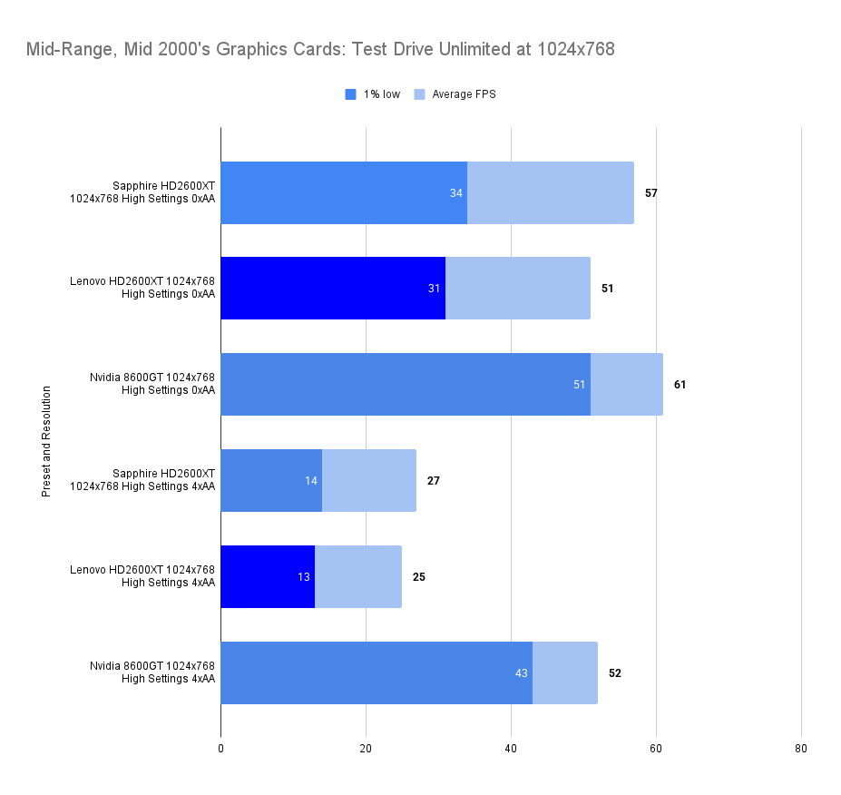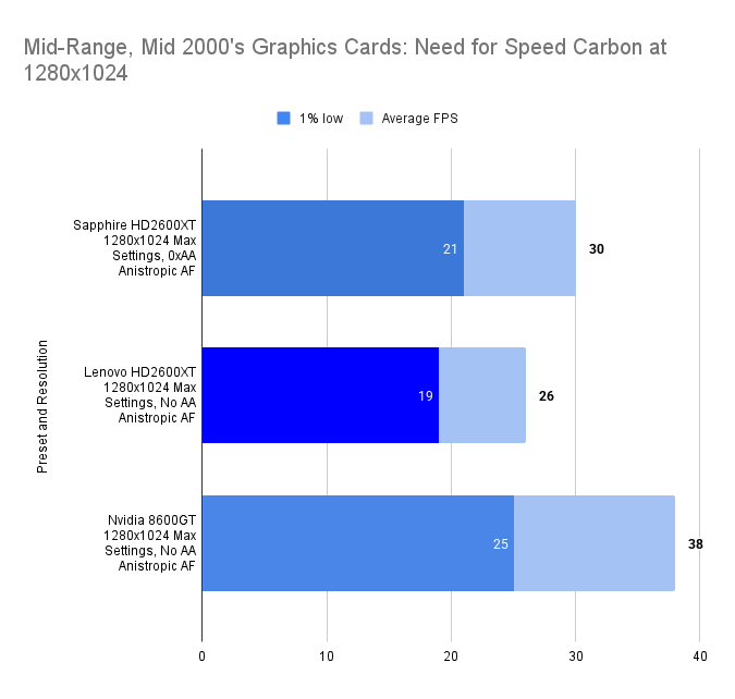 The Lenovo HD2600XT holds its own against the faster-clocked Sapphire variant, matching its 1% lows and trailing only slightly in average FPS. Despite the clock disadvantage, the 512MB VRAM ensures smoother asset handling, especially with high texture detail enabled. Compared to the 8600GT, the Lenovo card delivers a far more stable experience, with double the 1% lows and a 26% higher average. This resolution showcases the Lenovo’s balance: not the fastest, but consistently fluid in this game.