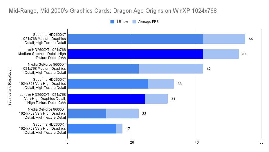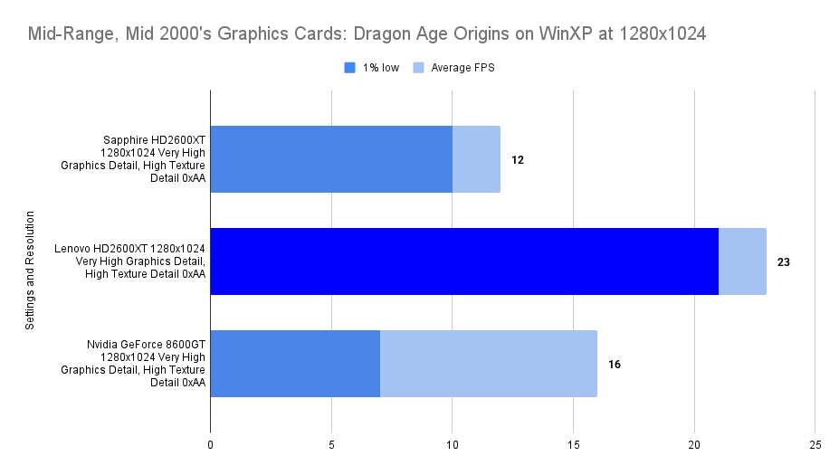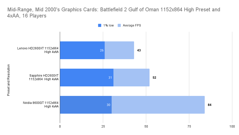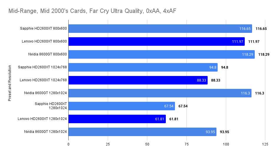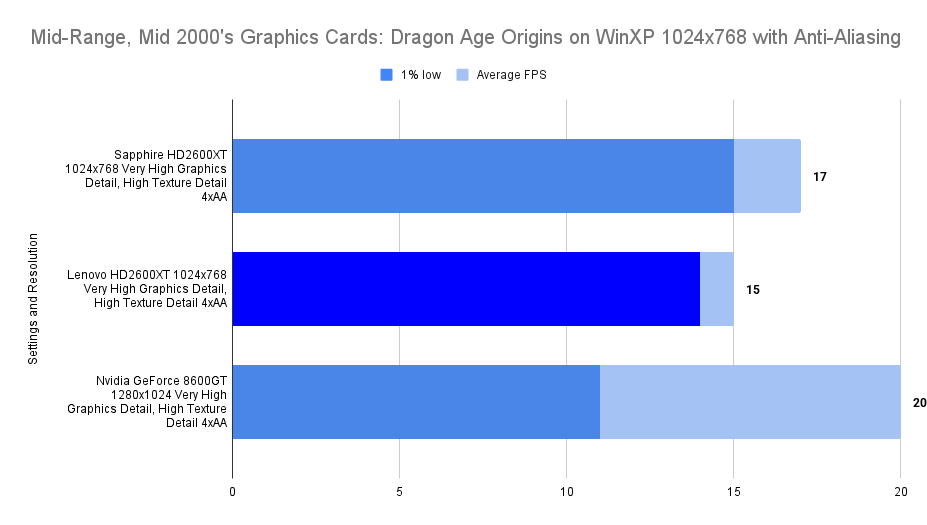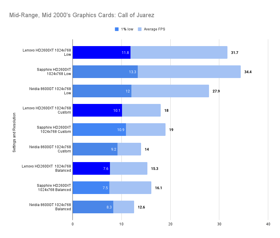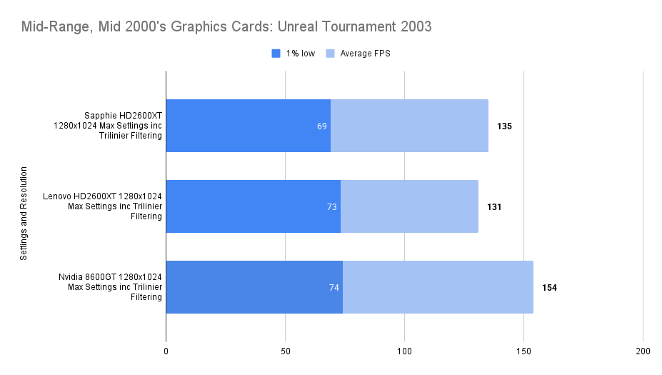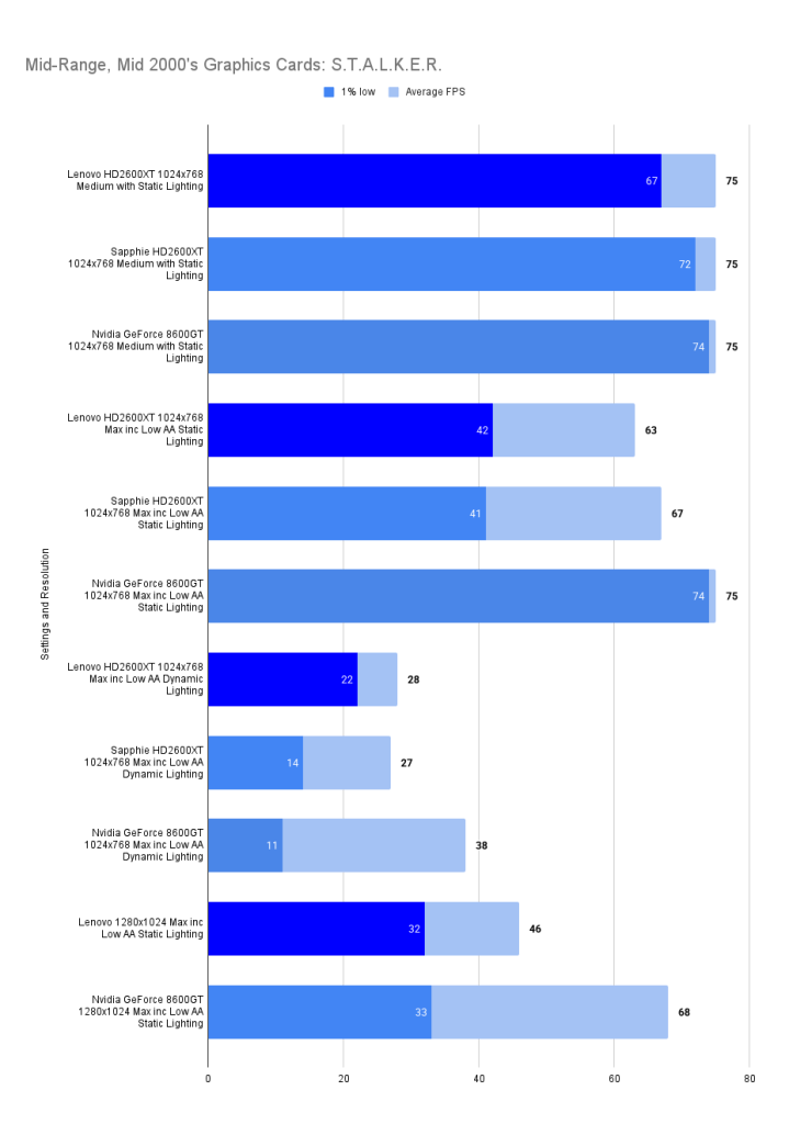 At this resolution, the Lenovo HD2600XT pulls ahead decisively. Its 512MB buffer allows it to absorb the increased texture load without stutter, nearly doubling the average FPS of the Sapphire and outperforming the 8600GT by a wide margin. The 1% lows remain stable, confirming that the card isn’t just faster — it’s smoother. This chart is the clearest demonstration of the Lenovo’s strength: when VRAM limits are breached, it becomes the most capable card in the lineup.