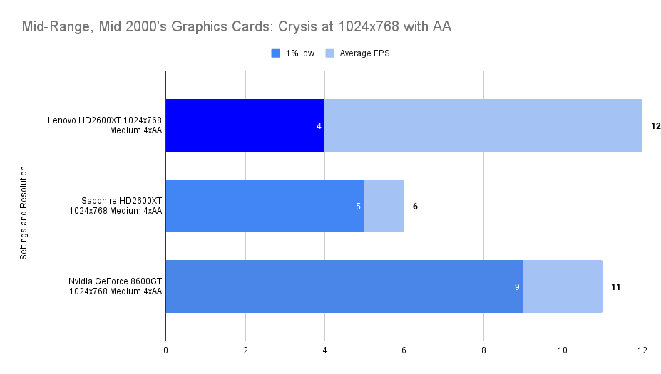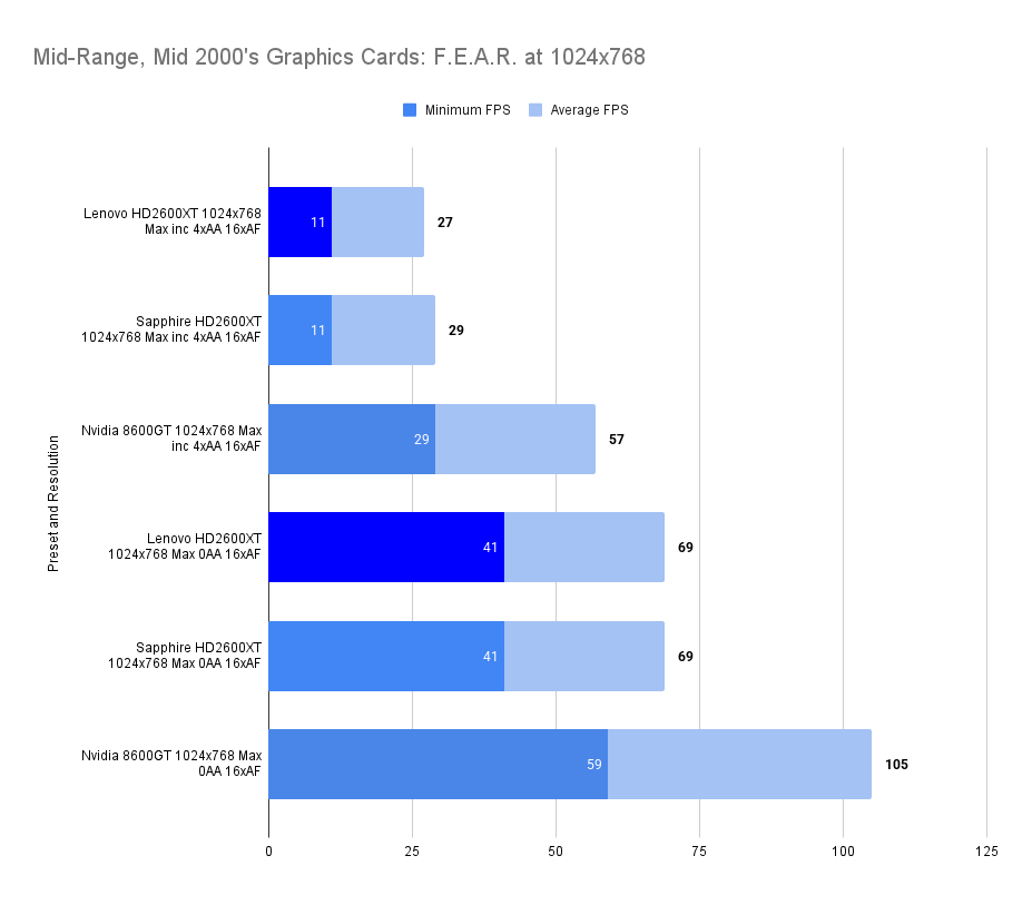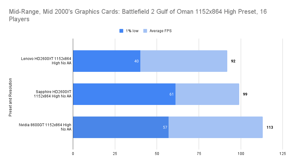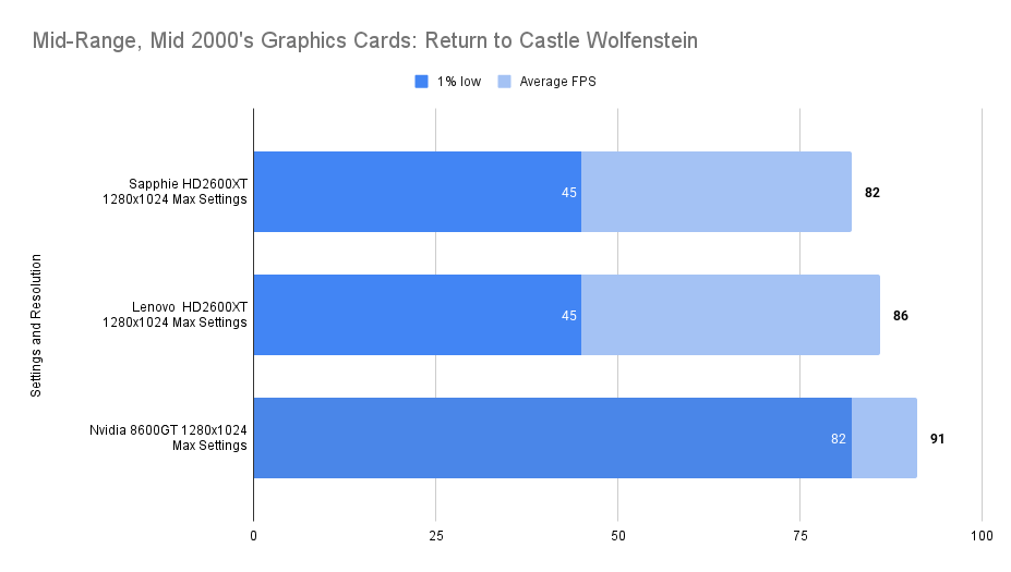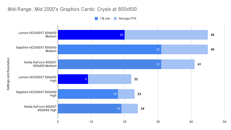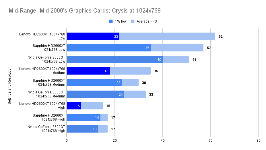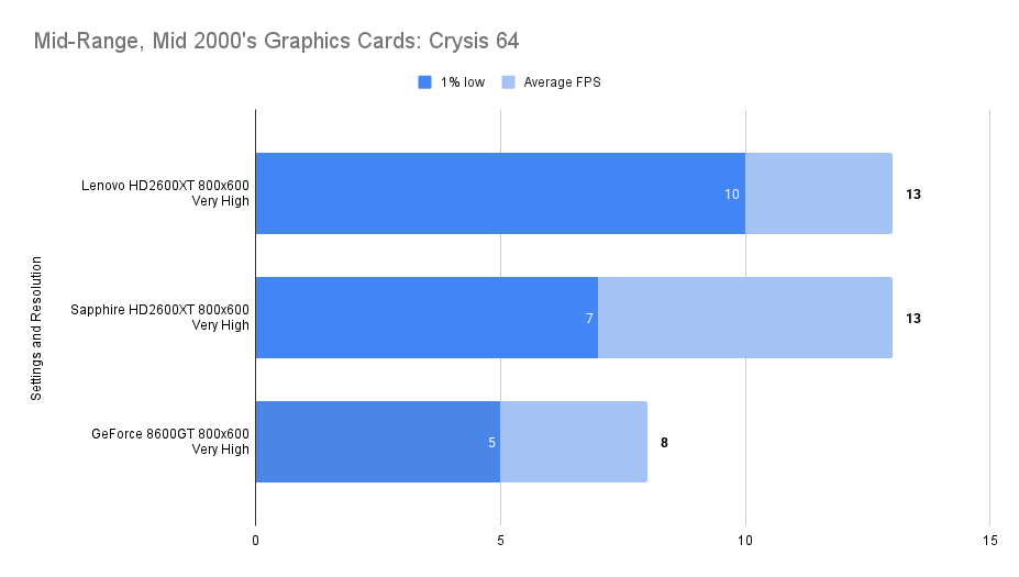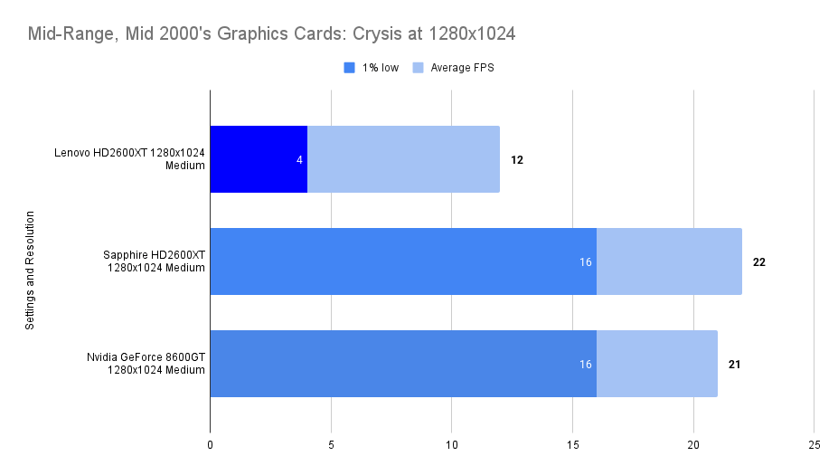At this resolution, the Lenovo HD2600XT pulls ahead decisively. Its 512MB buffer allows it to absorb the increased texture load without stutter, nearly doubling the average FPS of the Sapphire and outperforming the 8600GT by a wide margin. The 1% lows remain stable, confirming that the card isn’t just faster — it’s smoother. This chart is the clearest demonstration of the Lenovo’s strength: when VRAM limits are breached, it becomes the most capable card in the lineup.