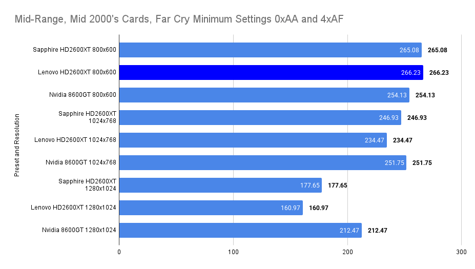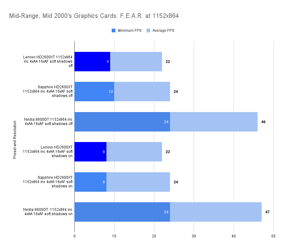 This is the most demanding scenario, and all cards dip into sub-20 FPS territory. The Lenovo HD2600XT at 800MHz still manages to edge out the competition in average framerate, despite a slightly lower minimum than the 8600GT. The VRAM ceiling is clearly being tested, and the Lenovo’s 512MB allows it to sustain higher throughput even when anti-aliasing and HDR are combined. The Sapphire card, constrained by 256MB, falls behind in both minimums and averages. This chart highlights the Lenovo’s resilience under memory-heavy conditions, especially when overclocked.