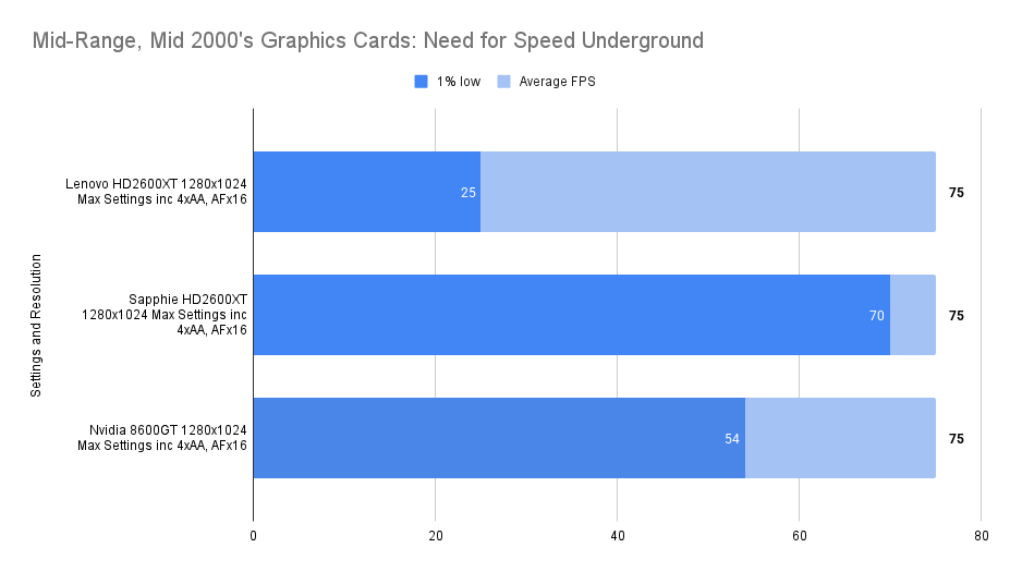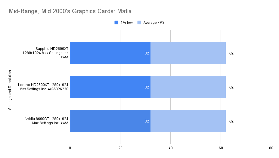 Dropping to low settings unlocks more of the Lenovo HD2600XT’s potential. The average framerate climbs to 29 FPS, and the 1% lows improve significantly. While the Sapphire and 8600GT still lead in raw numbers, the Lenovo card narrows the gap and maintains consistent performance. The 512MB VRAM helps absorb texture loads without fallback stutter, and the card’s behaviour here suggests it’s well-suited for low-detail play at this resolution, especially in longer sessions.