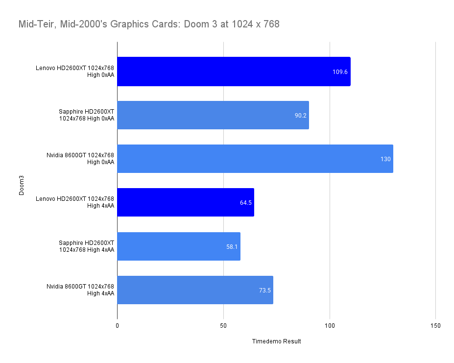 The 1024×768 with 4xAA test is where the Lenovo card truly falters. Despite having more VRAM, it posts the lowest figures across the board. The Sapphire card also struggles, but its frame pacing remains tighter. The 8600GT edges ahead, showing that its architecture handles AA more gracefully in this title. The Lenovo’s poor showing here reinforces the idea that something deeper is amiss, possibly driver-level or a quirk in the OEM BIOS.