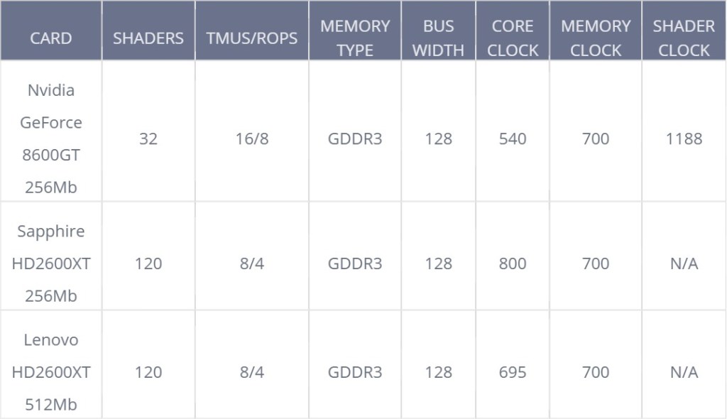 | Nvidia 8600GT | Lenovo HD2600XT | Sapphire HD2600XT | |
