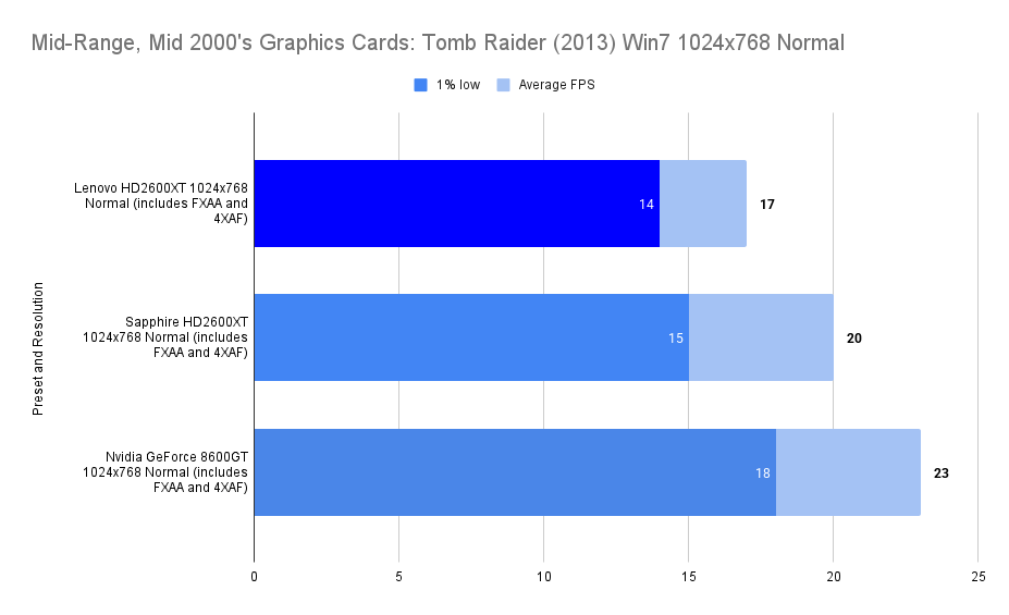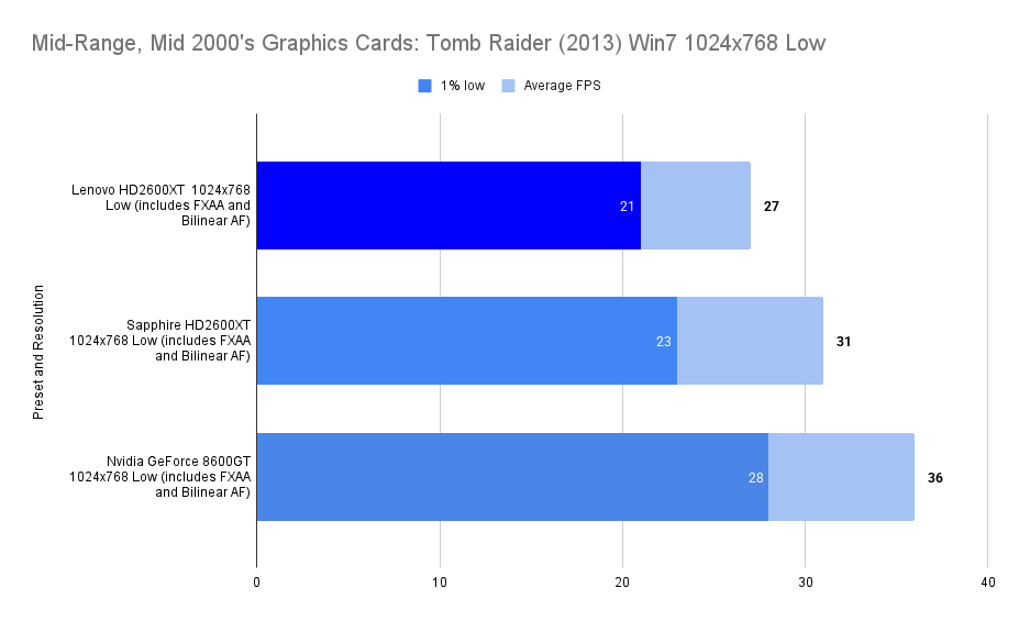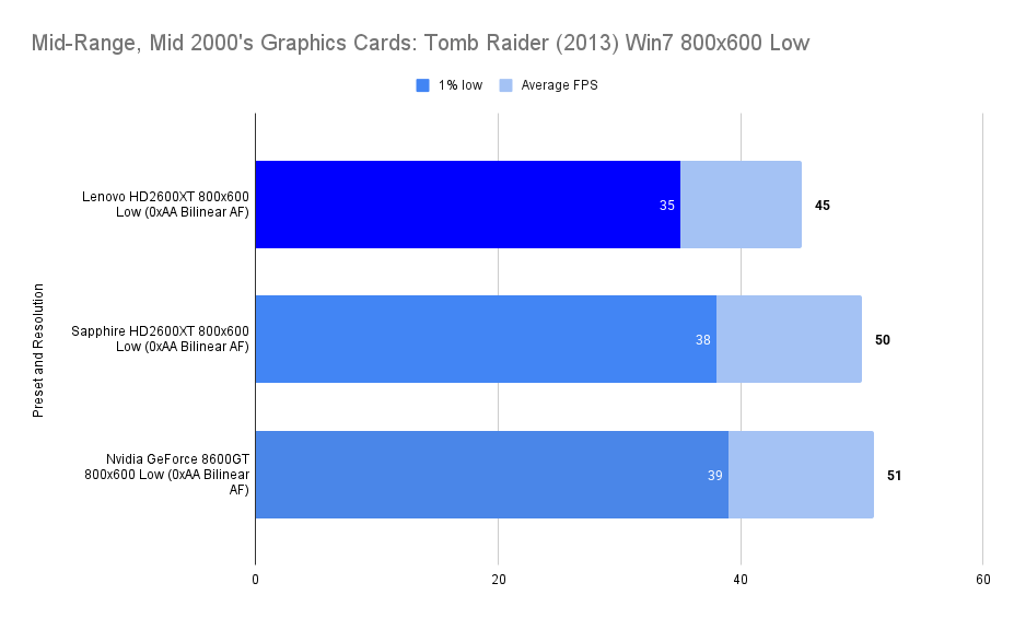 At 800×600, the Lenovo HD2600XT finally stretches its legs. With an average of 45 FPS and a 1% low of 35, it delivers a smooth and responsive experience. While the Sapphire and 8600GT edge ahead in raw framerate, the Lenovo card’s performance is close enough to be indistinguishable in practice. The extra VRAM ensures no sudden dips or asset streaming hiccups, making this resolution the sweet spot for the Lenovo card in Tomb Raider (2013). It’s a reminder that OEM doesn’t mean underpowered, just tuned for a different kind of resilience