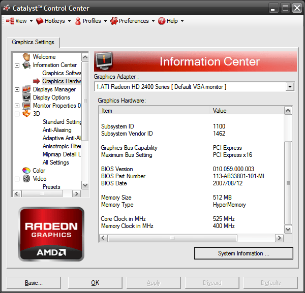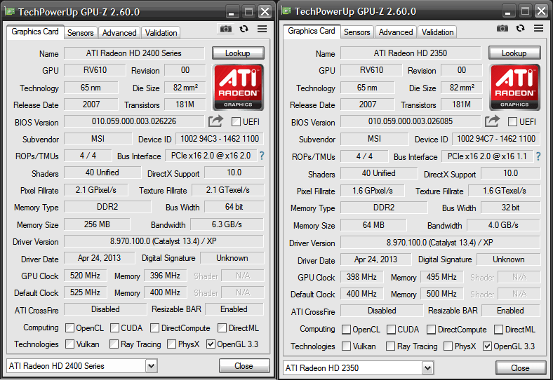 My own card here is the 2400Pro with 256Mb of on-card GDDR2 but using a 64bit memory bus.