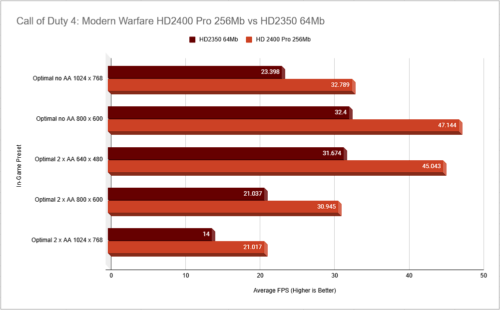 Owners of the cheaper HD2350 would likely want to drop down to 800×600 medium settings for a smooth experience.