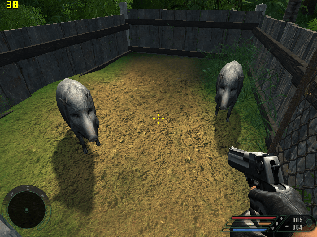 Here we go again, clearing out the first village of the game with Fraps running. I followed the same path down the hill, explode the barrel, kill the mercenaries, through the building them up to free the wild boars.