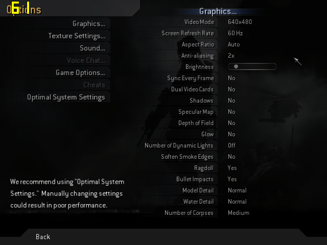 The ‘Optimal System Settings’ graphics option came up with the below as the recommended levels, I knocked up the resolution to the higher levels to see if it was still playable and toggled on and off Anti Aliasing to see what difference is made.