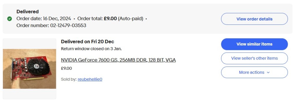 I picked up this Palit 7600 GS for just £9 delivered, which feels like an absolute steal. If only I could find another at that price for some SLI action.