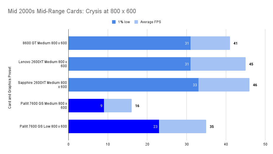 Not bad at all at 800 x 600 with V. High Settings, not too far distant from the newer cards and their unified shaders.