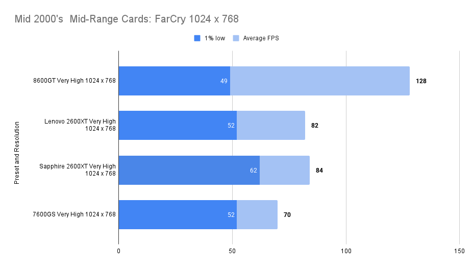 At 1280 x 1024 with very high settings the 7600GS is very much mixing with the much newer 2600XTs. Impressive stuff.