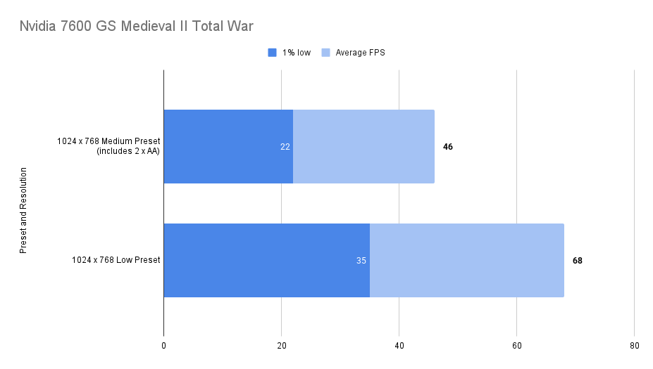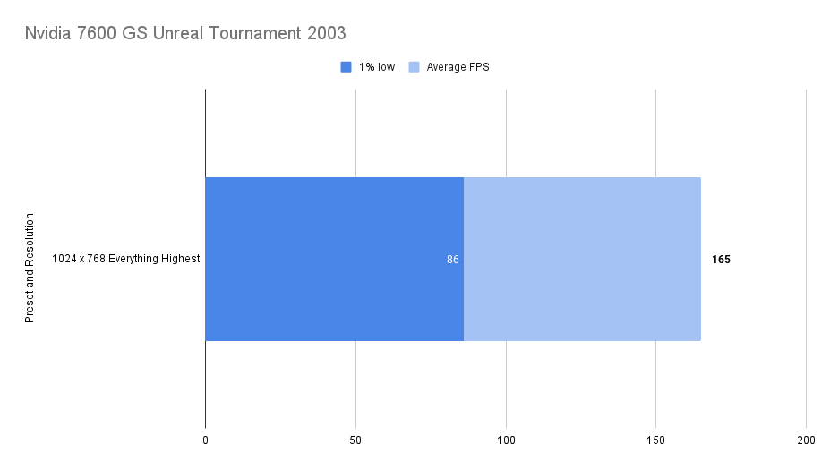 The 7600GS gave a reasonable showing at 800 x 600 with an average framerate up there with the more modern cards at Medium Settings.