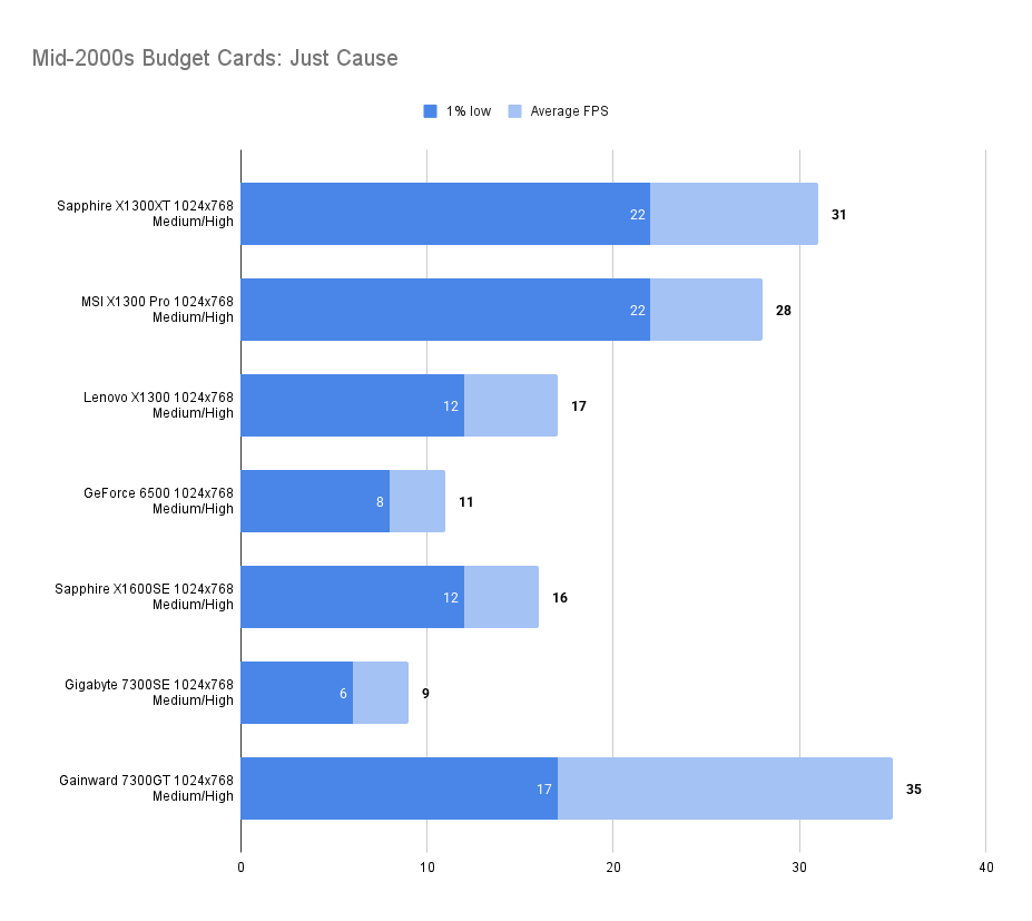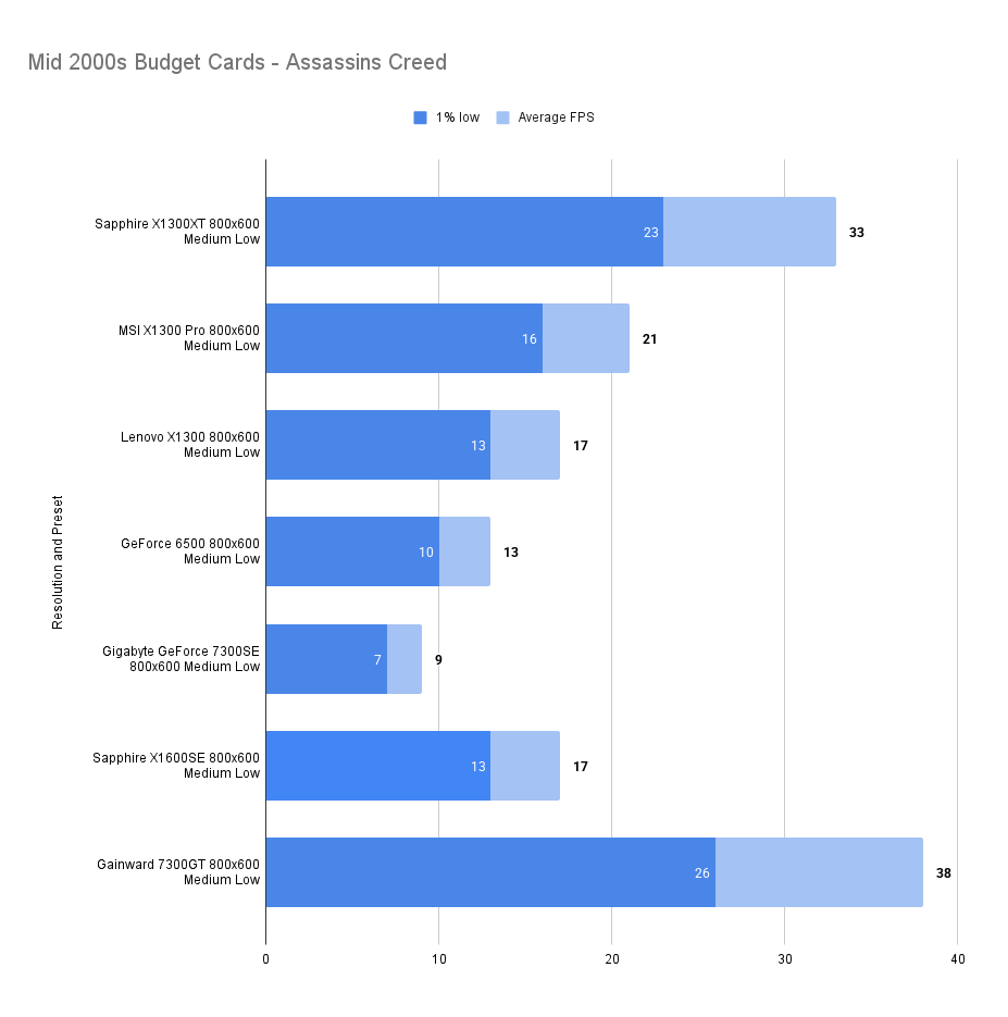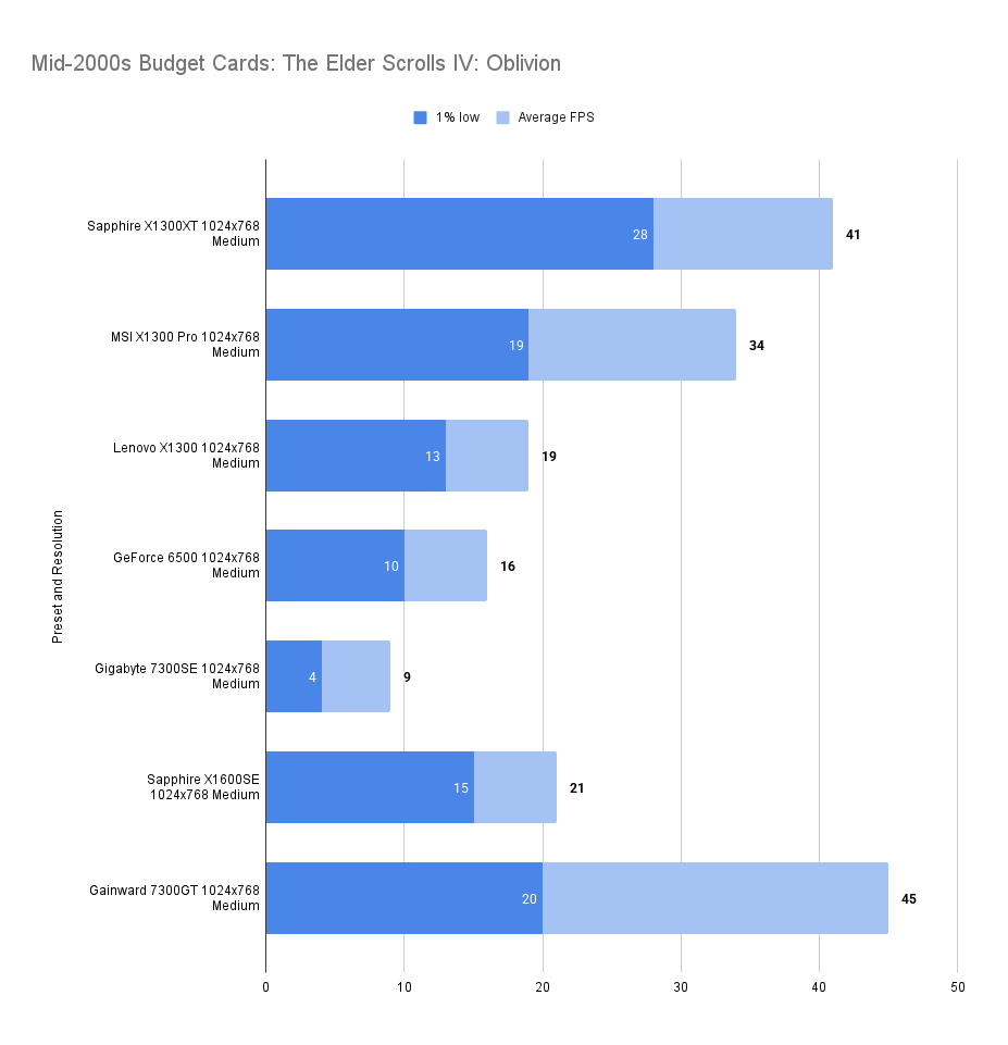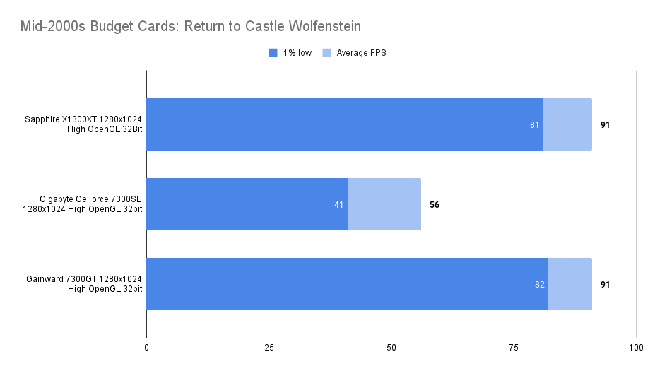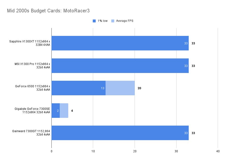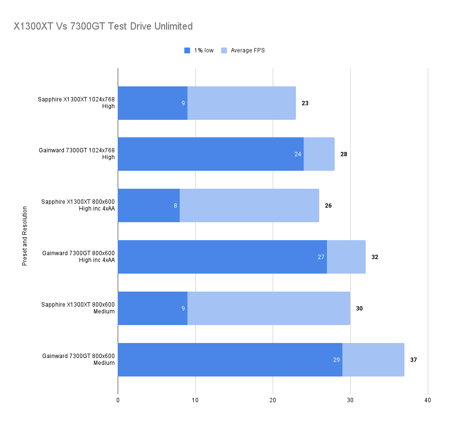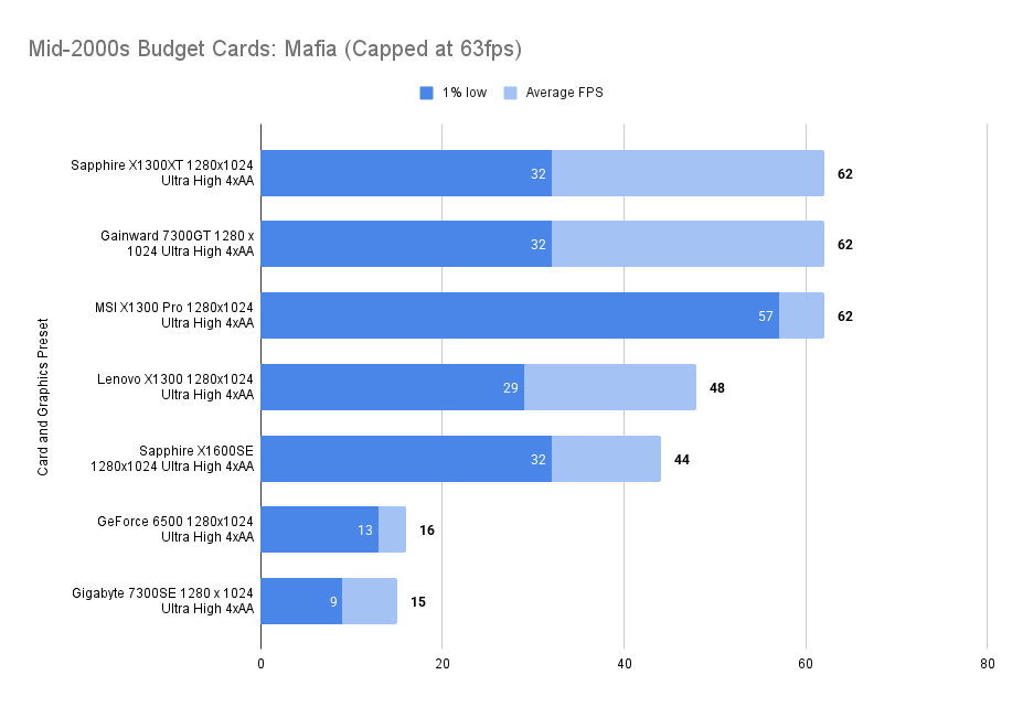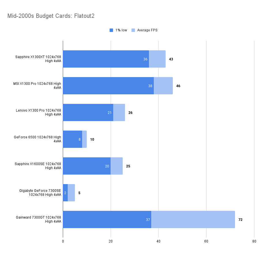 The X1300XT embarrasses itself here — the average framerate is fine, but the 1% low is far worse than the 7300GT. I’ll get the X1300Pro in and update this.