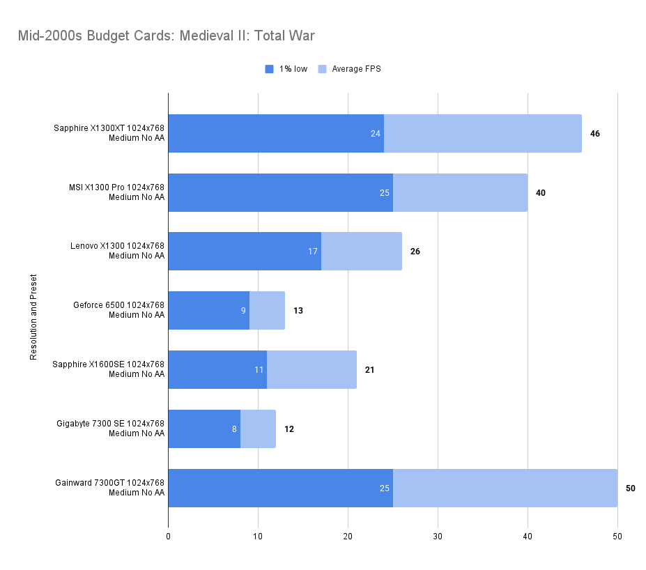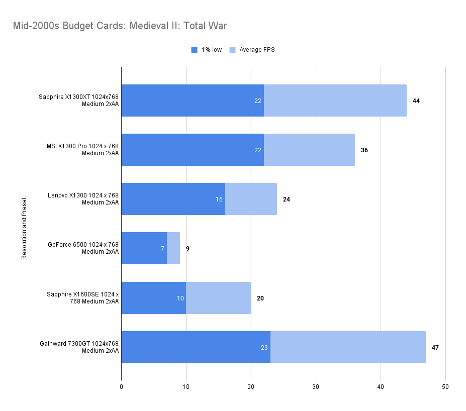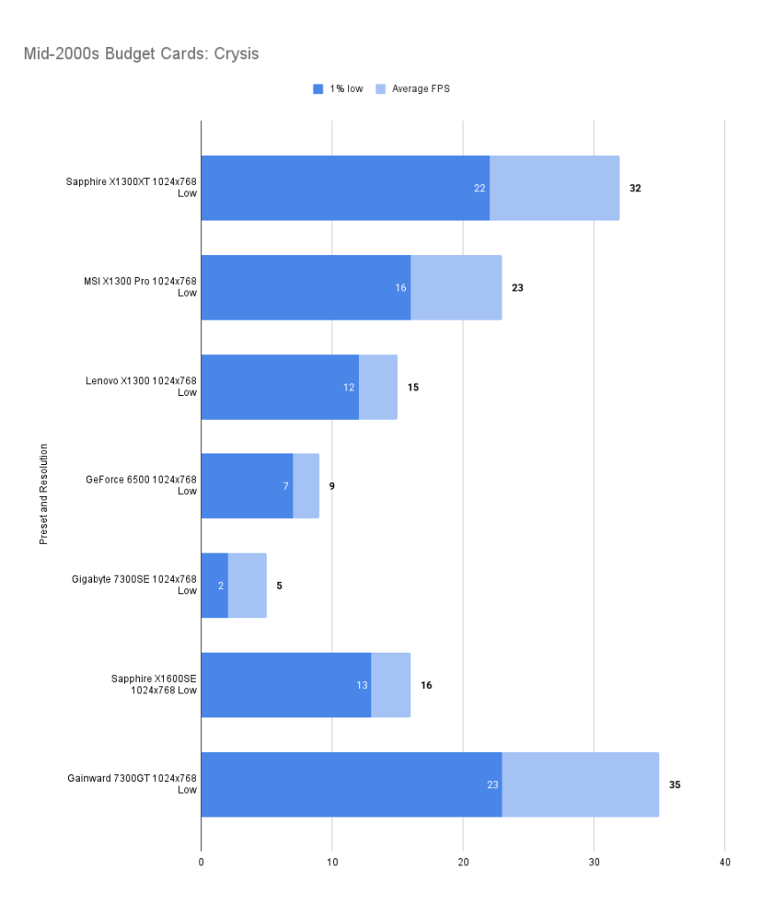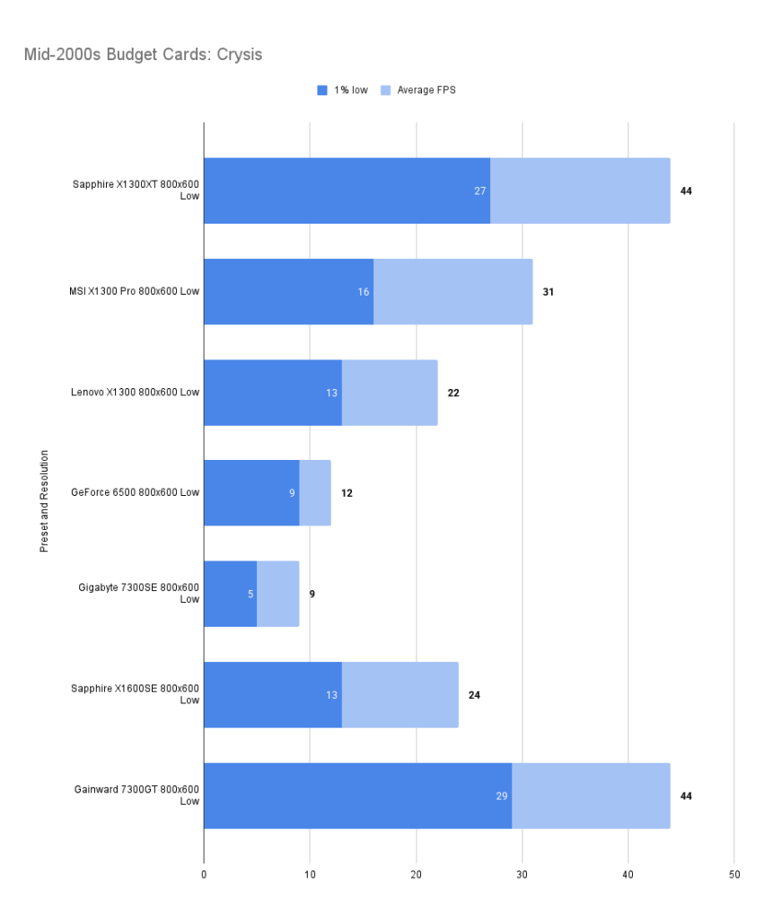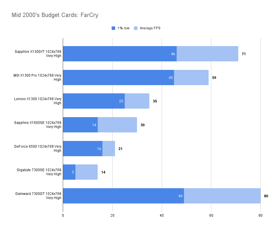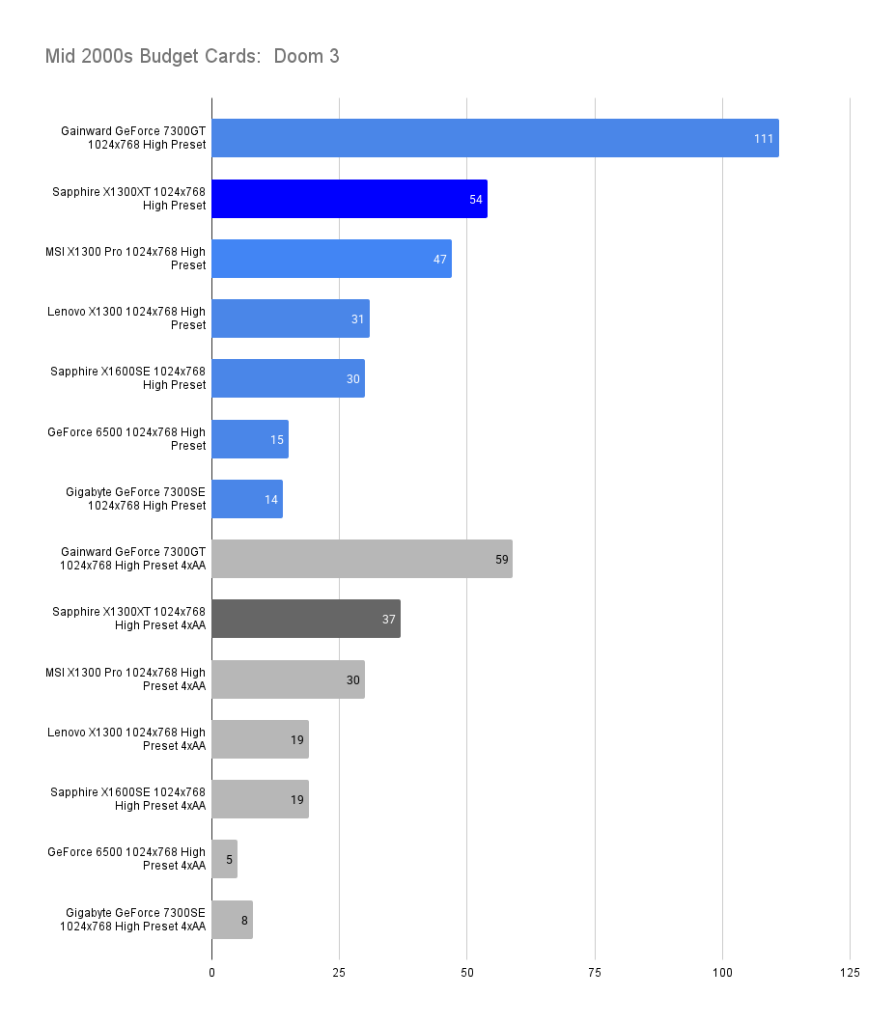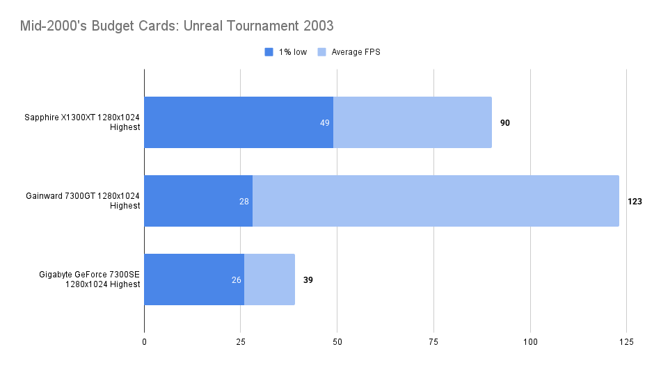 The X1300XT embarrasses itself here — the average framerate is fine, but the 1% low is far worse than the 7300GT. I’ll get the X1300Pro in and update this.