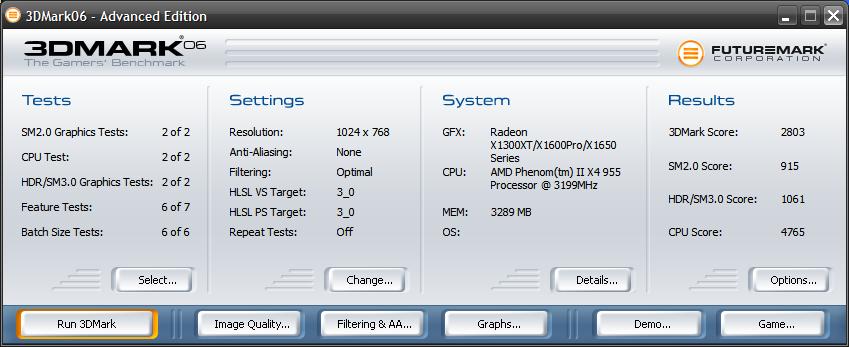 I’m forced to assume that they are using standard settings for their 1280×1024 setting, if they are not then it may explain the lackluster performance of my card, but then there aren’t a great many options available in the software.