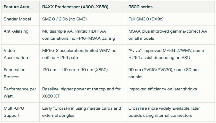 Where the older R3xx/R4xx designs were fixed‑function, SM2.0‑class parts with strong brute‑force fillrate and AA performance for their time, the X1000 series moved to fully SM3.0‑capable pipelines with more emphasis on shader flexibility and branching. This brought ATI up to feature parity with Nvidia’s contemporary GeForce 7 cards while laying the groundwork for more complex shader‑heavy games that would follow.