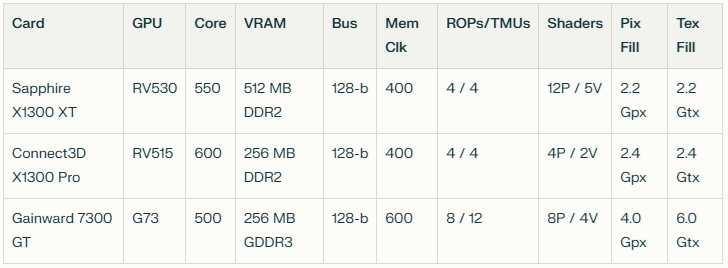 At the end of the fixed‑pipeline era, both ATI and Nvidia decided to use their mid‑range GPUs to top out the budget end of their product stacks, creating the X1300XT (with the die of an X1650) and the 7300GT (with the die of a 7600).
